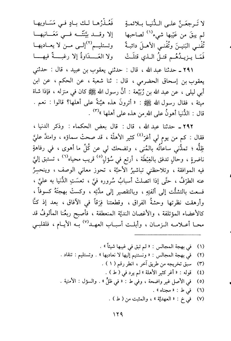 268 - حَدَّثَنِي يَعْقُوبُ بْنُ عُبَيْدٍ، قَالَ: حَدَّثَنِي يَعْقُوبُ بْنُ إِسْحَاقَ الْحَضْرَمِيُّ، قَالَ: ثنا شُعْبَةُ، عَنِ الْحَكَمِ، عَنِ ابْنِ أَبِي لَيْلَى، عَنْ عَبْدِ اللَّهِ بْنِ رَبِيعَةَ، أَنَّ رَسُولَ اللَّهِ صَلَّى اللَّهُ عَلَيْهِ وَسَلَّمَ كَانَ فِي مَنْزِلِهِ فَإِذَا شَاةٌ مَيِّتَةٌ، فَقَالَ رَسُولُ اللَّهِ صَلَّى اللَّهُ عَلَيْهِ وَسَلَّمَ: «§أَتَرَوْنَ هَذِهِ هَيِّنَةً عَلَى أَهْلِهَا؟» ، قَالُوا: نَعَمْ قَالَ: «الدُّنْيَا أَهْوَنُ عَلَى اللَّهِ مِنْ هَذِهِ عَلَى أَهْلِهَا» قَالَ بَعْضُ الْحُكَمَاءِ، وَذَكَرَ الدُّنْيَا، فَقَالَ: كَمْ مِنْ يَوْمٍ لِي أَغَرَّ كَثِيرِ الْأَهِلَّةِ، قَدْ صَحَّتْ سَمَاؤُهُ، وَامْتَدَّ عَلَيَّ ظِلُّهُ، تَمُدُّنِي سَاعَاتُهُ بِالْمُنَى، وَتَضْحَكُ لِي عَنْ كُلِّ مَا أَهْوَى فِي رَفَاهَةٍ نَاضِرَةٍ، وَخَالٍ تَدَفَّقُ بِالْغِبْطَةِ، أَرْتَعُ فِي سُؤْلٍ قَرِيبٍ مَحْيَاهُ، تَسْتَبِقُ إِلَيَّ فِيهِ الْمُوَافَقَةُ، وَتُلَاحِظُنِي تَبَاشِيرُ الْأَحِبَّةِ، تَحُوزُ مَعَانِي الْوَصْفِ وَيَنْحَسِرُ عَنْهُ الطَّرْفِ، حَتَّى إِذَا اتَّصَلَتْ أَسْبَابُ سُرُورِهِ فِيَّ، وَكَسَتْ بَهْجَتَهُ كُسُوفًا، وَأَرْهَقَتْ نَظَرْتَهَا وَحْشَةُ الْفِرَاقِ، وَقَطَّعَتْنَا فِرَقًا فِي الْآفَاقِ، بَعْدَ إِذْ كُنَّا كَالْأَعْضَاءِ الْمُؤْتَلِفَةِ، وَالْأَغْصَانِ النَّدِيَّةِ الْمُنْعَطِفَةِ، فَأَصْبَحَ رِبْعُنَا الْمَأْلُوفُ قَدْ مَحَا أَعْلَامَهُ الزَّمَانُ، وَأَبْلَتْ أَسْبَابَ الْعَهْدِ بِهِ الْأَيَّامُ، فَلِقَلْبِي -[130]- وُجُوبٌ عِنْدَ ذِكْرِهِمْ، يَكَادُ يَتَفَطَّرُ جَزَعًا مِمَّا يُعَايِنُ مِنْ فَقْدِهِمْ، وَيُقَاسِي مِنْ بُعْدِهِمْ، وَنَظَرَاتِي تُطْرَدُ فِي الْجُفُونِ مِنْ حَرَارَاتِ الْكَمَدِ، وَأَوْجَاعِ كُلُومٍ لَا تَنْدَمِلُ، فَمَا لِي وَلِلْمَقَامِ فِي مَرَاتِعِ الْأَشْجَانِ، وَمَرَابِضِ الْمَنَايَا، وَأَوْعِيَةِ الرَّزَايَا