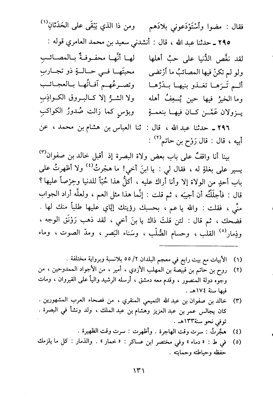 271 - ثنا الْعَبَّاسُ بْنُ هِشَامِ بْنِ مُحَمَّدٍ، عَنْ أَبِيهِ، قَالَ: قَالَ رَوْحُ بْنُ حَاتِمٍ: بَيْنَا أَنَا وَاقِفٌ عَلَى بَابِ بَعْضِ وُلَاةِ الْبَصْرَةِ إِذْ أَقْبَلَ خَالِدُ بْنُ صَفْوَانَ يَسِيرُ عَلَى بَغْلَةٍ لَهُ، فَقَالَ لِي: يَا ابْنَ أَخِي، مَا هَجَّرْتُ، وَلَا أَظْهَرْتُ عَلَى بَابِ أَحَدٍ مِنَ الْوُلَاةِ إِلَّا وَأَنَا أَرَاكَ عَلَيْهِ، أَكُلُّ هَذَا حُبًّا لِلدُّنْيَا وَحِرْصًا عَلَيْهَا؟ قَالَ: فَأَجْلَلْتُهُ أَنْ أُجِيبَهُ، ثُمَّ قُلْتُ: إِنَّمًا هَذَا مِثْلُ الْعَمِّ، وَلَعَلَّهُ أَرَادَ الْجَوَابَ مِنِّي، فَقُلْتُ: وَاللَّهِ يَا عَمِّ بِحَسْبِكَ رُؤْيَتُكَ إِيَّايَ عَلَيْهَا طَلَبًا مِنْكَ لَهَا، فَضَحِكَ، ثُمَّ قَالَ: لَئِنْ قُلْتَ ذَاكَ يَا ابْنَ أَخِي، لَقَدْ ذَهَبَ رَوْنَقُ الْوَجْهِ، وَذِمَارُ الْقَلْبِ، وَحُسَامُ الصُّلْبِ، وَسَنَاءُ الْبَصَرِ، وَمَدُّ الصَّوْتِ، وَمَاءُ -[132]- الشَّبَابِ، وَاقْتَرَبَ عِهَادُ الْعِلَلِ، وَاللَّهِ §مَا أَتَتْ عَلَيْنَا سَاعَةٌ مِنْ أَعْمَارِنَا إِلَّا وَنَحْنُ نُؤْثِرُ الدُّنْيَا عَلَى مَا سِوَاهَا، ثُمَّ لَا تَزْدَادُ لَنَا إِلَّا تَخَلِّيًا، وَعَنَّا إِلَّا تَوَلِّيًا، ثُمَّ ضَرَبَ دَابَّتَهُ وَذَهَبَ "