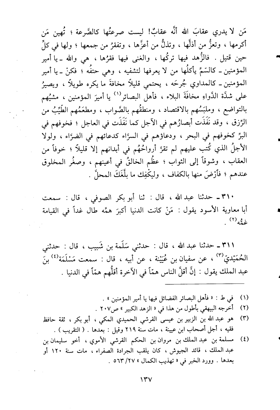 284 - حَدَّثَنِي سَلَمَةُ بْنُ شَبِيبٍ، قَالَ: حَدَّثَنِي الْحُمَيْدِيُّ، عَنْ سُفْيَانَ بْنِ عُيَيْنَةَ، عَنْ أَبِيهِ، قَالَ: سَمِعْتُ مَسْلَمَةَ بْنَ عَبْدِ الْمَلِكِ، يَقُولُ: «§إِنَّ أَقَلَّ النَّاسِ هَمًّا فِي الْآخِرَةِ أَقَلُّهُمْ هَمًّا فِي الدُّنْيَا» -[138]- أَنْشَدَنِي سُلَيْمَانُ بْنُ أَبِي شَيْخٍ: