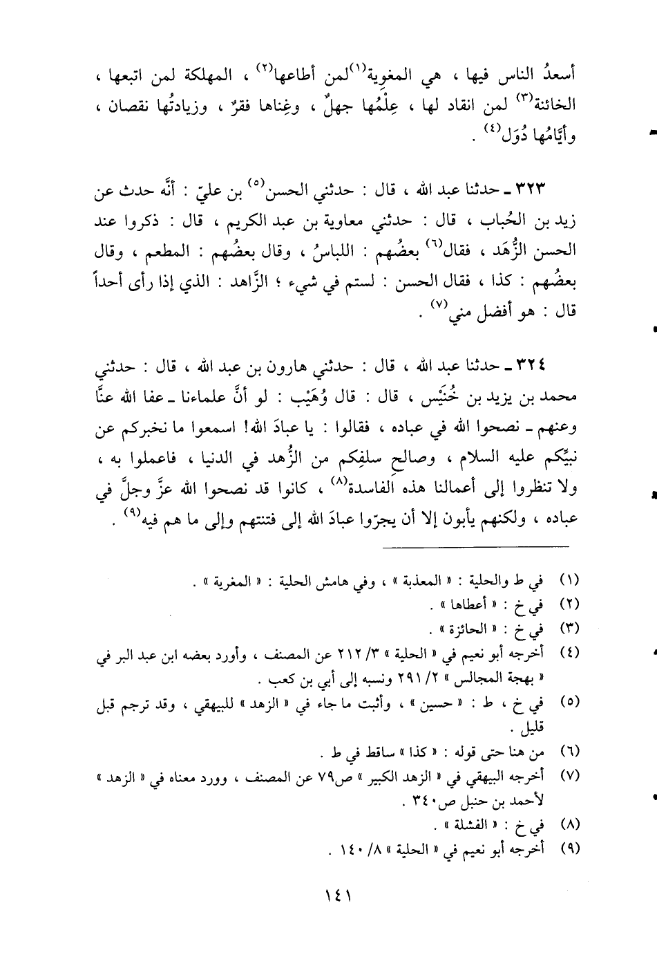 294 - حَدَّثَنِي هَارُونُ بْنُ عَبْدِ اللَّهِ، قَالَ: حَدَّثَنِي مُحَمَّدُ بْنُ يَزِيدَ بْنِ خُنَيْسٍ، قَالَ: قَالَ وُهَيْبٌ: " §لَوْ أَنَّ عُلَمَاءَنَا عَفَا اللَّهُ عَنَّا وَعَنْهُمْ نَصَحُوا اللَّهَ فِي عِبَادِهِ، فَقَالُوا: يَا عِبَادَ اللَّهِ اسْمَعُوا مَا نُخْبِرُكُمْ عَنْ نَبِيِّكُمْ عَلَيْهِ السَّلَامُ، وَصَالِحِ سَلَفِكُمْ مِنَ الزُّهْدِ فِي الدُّنْيَا، فَاعْمَلُوا بِهِ، وَلَا تَنْظُرُوا إِلَى أَعْمَالِنَا هَذِهِ الْفَاسِدَةِ كَانُوا قَدْ نَصَحُوا اللَّهَ عَزَّ وَجَلَّ فِي عِبَادِهِ، وَلَكِنَّهُمْ يَأْبُونَ إِلَّا أَنْ يَجُرُّوا عِبَادَ اللَّهِ إِلَى فِتْنَتِهِمْ، وَإِلَى مَا هُمْ فِيهِ "