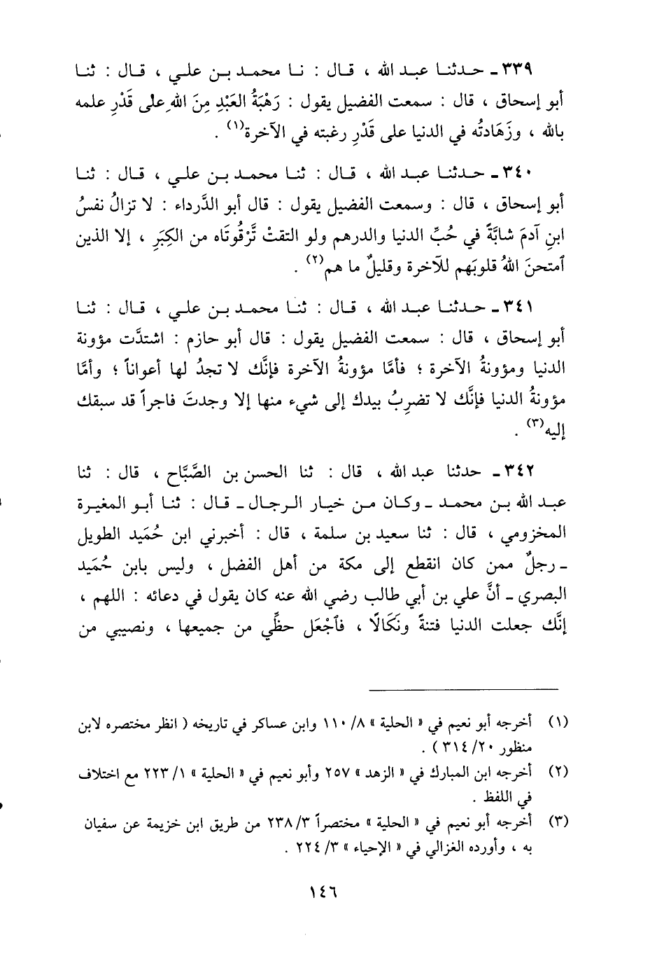 309 - نا مُحَمَّدُ بْنُ عَلِيٍّ، قَالَ: ثنا أَبُو إِسْحَاقَ، قَالَ: سَمِعْتُ الْفُضَيْلَ، يَقُولُ: «§رَهْبَةُ الْعَبْدِ مِنَ اللَّهِ عَلَى قَدْرِ عِلْمِهِ بِاللَّهِ، وَزَهَادَتُهُ فِي الدُّنْيَا عَلَى قَدْرِ رَغْبَتِهِ فِي الْآخِرَةِ»
