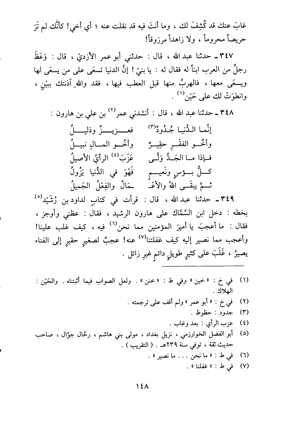314 - حَدَّثَنِي 2438 أَبُو عُمَرَ الْأَزْدِيُّ، قَالَ: وَعَظَ رَجُلٌ مِنَ الْعَرَبِ ابْنًا لَهُ فَقَالَ لَهُ: يَا بُنَيَّ إِنَّ الدُّنْيَا تَسْعَى عَلَى مَنْ يَسْعَى لَهَا، وَيَسْعَى مَعَهَا، فَالْهَرَبُ مِنْهَا قَبْلَ الْعَطَبِ فِيهَا، فَقَدْ وَاللَّهِ §آذَنَتْكَ بِبَيْنٍ، وَانْطَوَتْ لَكَ عَلَى حَيْنٍ أَنْشَدَنِي عُمَرُ بْنُ عَلِيِّ بْنِ هَارُونَ: