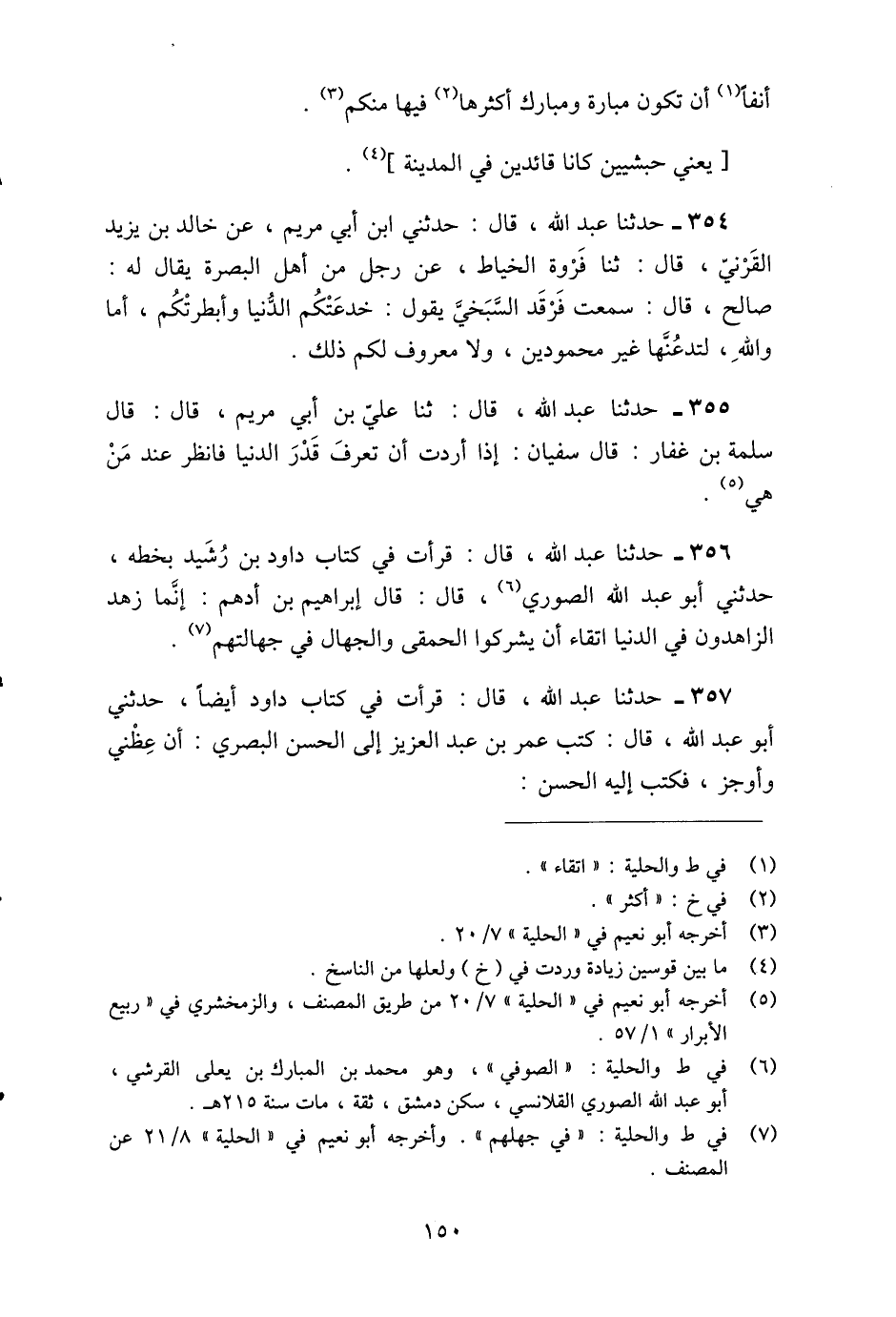 320 - ثنا عَلِيُّ بْنُ أَبِي مَرْيَمَ، قَالَ: قَالَ سَلَمَةُ بْنُ غِفَارٍ: قَالَ سُفْيَانُ: «§إِذَا أَرَدْتَ أَنْ تَعْرِفَ قَدْرَ الدُّنْيَا فَانْظُرْ عِنْدَ مَنْ هِيَ» قَرَأْتُ فِي كِتَابِ دَاوُدَ بْنِ رُشَيْدٍ بِخَطِّهِ، حَدَّثَنِي أَبُو عَبْدِ اللَّهِ الصُّورِيُّ، قَالَ: قَالَ إِبْرَاهِيمُ بْنُ أَدْهَمَ: إِنَّمَا زُهْدُ الزَّاهِدُونَ فِي الدُّنْيَا اتِّقَاءَ أَنْ يُشْرِكُوا الْحَمْقَى وَالْجُهَّالَ فِي جَهَالَتِهِمْ