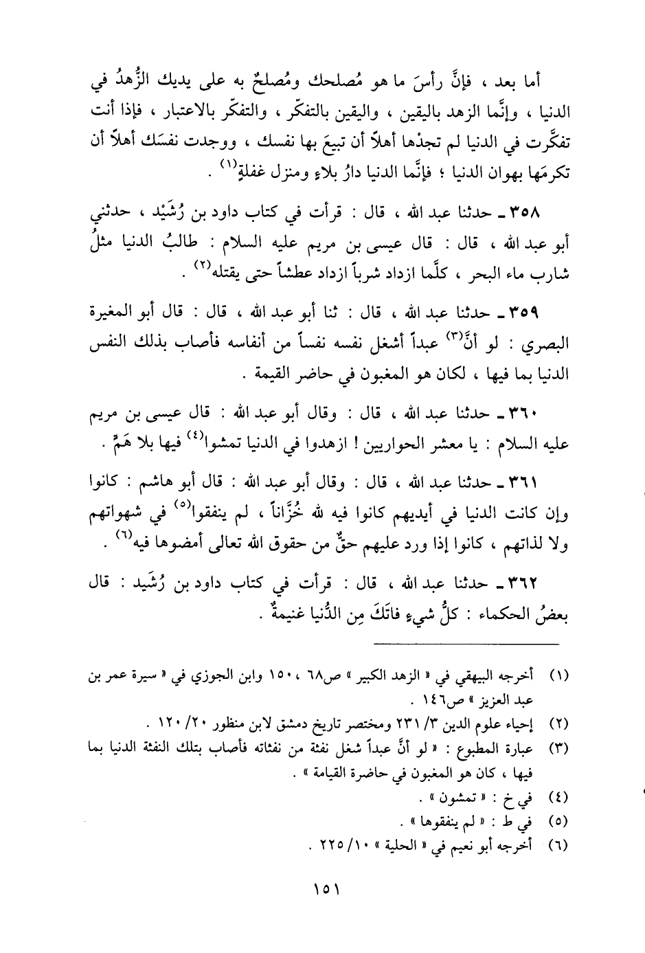 325 - قَالَ: وَقَالَ أَبُو عَبْدِ اللَّهِ: قَالَ أَبُو هَاشٍمٍ: كَانًوا وَإِنْ §كَانَتِ الدُّنْيَا بِأَيْدِيهِمْ كَانُوا فِيهِ للَّهِ خُزَّانًا، لَمْ يُنْفِقُوا فِي شَهَوَاتِهِمْ وَلَا لَذَّاتِهِمْ، كَانُوا إِذَا وَرَدَ عَلَيْهِمْ حَقٌّ مِنْ حُقُوقِ اللَّهِ تَعَالَى أَمْضَوْهَا فِيهِ ". قَرَأْتُ فِي كِتَابِ دَاوُدَ بْنِ رُشَيْدٍ: قَالَ بَعْضُ الْحُكَمَاءِ: «كُلُّ شَيْءٍ فَاتَكَ مِنَ الدُّنْيَا غَنِيمَةٌ»