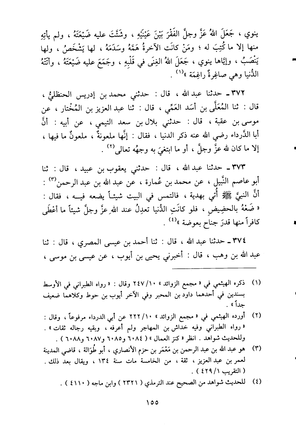 334 - حَدَّثَنِي مُحَمَّدُ بْنُ إِدْرِيسَ الْحَنْظَلِيُّ، قَالَ: ثنا الْمُعَلَّى بْنُ أَسَدٍ الْعَمِّيُّ، قَالَ: ثنا عَبْدُ الْعَزِيزِ بْنُ الْمُخْتَارِ، عَنْ مُوسَى بْنِ عُقْبَةَ، قَالَ: حَدَّثَنِي بِلَالُ بْنُ سَعْدٍ التَّيْمِيُّ، عَنْ أَبِيهِ، أَنَّ أَبَا الدَّرْدَاءِ، رَضِيَ اللَّهُ عَنْهُ §ذَكَرَ الدُّنْيَا فَقَالَ: إِنَّهَا مَلْعُونَةٌ، مَلْعُونٌ مَا فِيهَا، إِلَّا مَا كَانَ لِلَّهِ عَزَّ وَجَلَّ، أَوْ مَا ابْتُغِيَ بِهِ وَجْهُهُ تَعَالَى