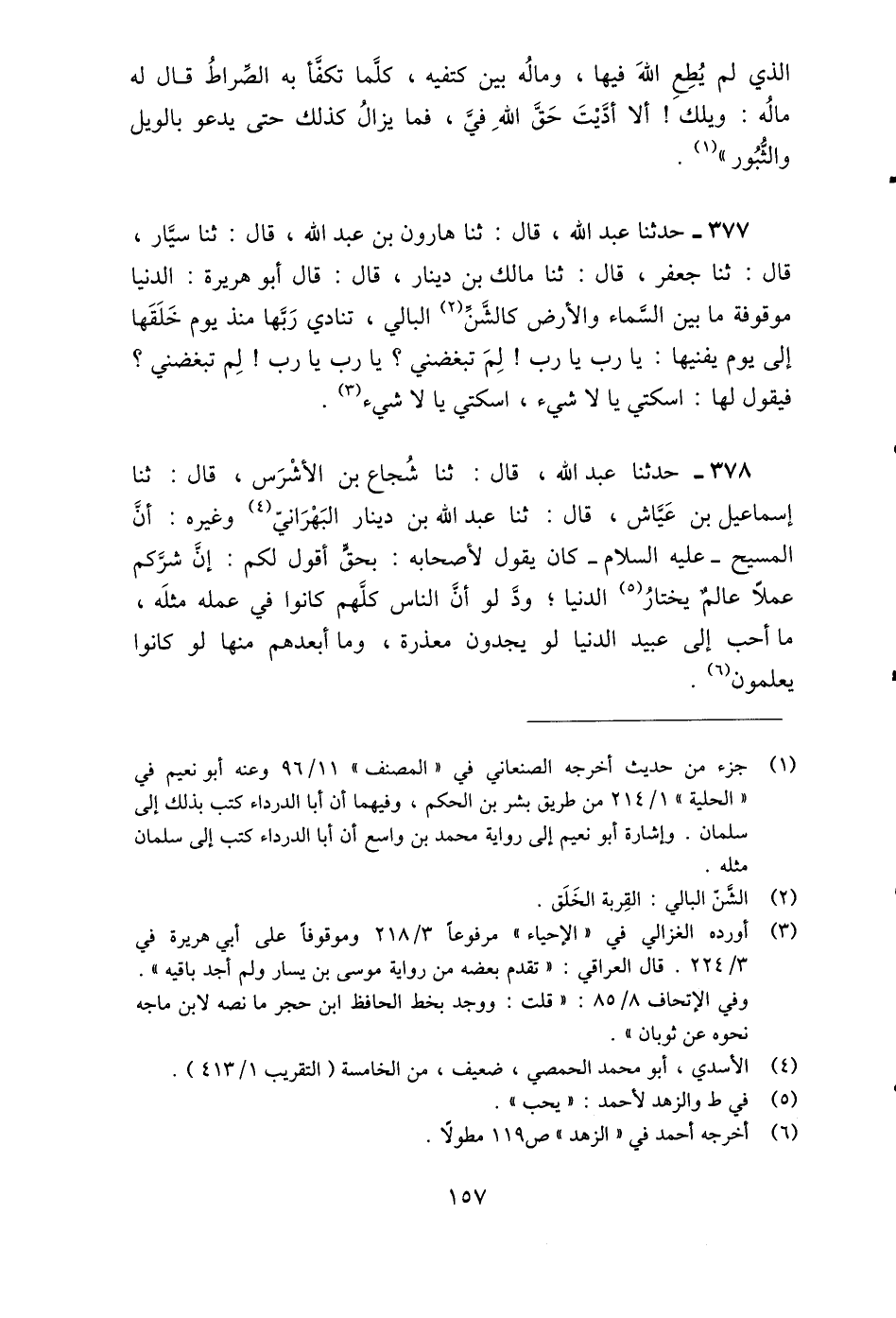 339 - ثنا هَارُونُ بْنُ عَبْدِ اللَّهِ، قَالَ: ثنا سَيَّارٌ، قَالَ: ثنا جَعْفَرٌ، قَالَ: ثنا مَالِكُ بْنُ دِينَارٍ، قَالَ: قَالَ أَبُو هُرَيْرَةَ: " §الدُّنْيَا مَوْقُوفَةٌ مَا بَيْنَ السَّمَاءِ وَالْأَرْضِ كَالشَّنِّ الْبَالِي، تُنَادِي رَبَّهَا مُنْذُ يَوْمِ خَلَقَهَا إِلَى يَوْمِ يُفْنِيهَا: يَا رَبِّ يَا رَبِّ، لِمَ تُبْغِضُنِي؟ يَا رَبِّ يَا رَبِّ، لِمَ تُبْغِضُنِي؟ فَيَقُولُ لَهَا: اسْكُتِي يَا لَا شَيْءَ، اسْكُتِي يَا لَا شَيْءَ "
