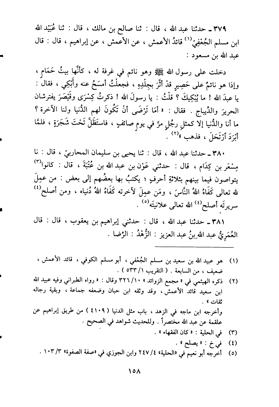341 - ثنا صَالِحُ بْنُ مَالِكٍ، قَالَ: ثنا عُبَيْدُ اللَّهِ بْنُ مُسْلِمٍ الْجُعْفِيُّ قَائِدُ الْأَعْمَشِ، عَنِ الْأَعْمَشِ، عَنْ إِبْرَاهِيمَ، قَالَ: قَالَ عَبْدُ اللَّهِ بْنُ مَسْعُودٍ: دَخَلْتُ عَلَى رَسُولِ اللَّهِ صَلَّى اللَّهُ عَلَيْهِ وَسَلَّمَ وَهُوَ نَائِمٌ فِي غُرْفَةٍ لَهُ كَأَنَّهَا بَيْتُ حَمَامٍ، وَإِذَا هُوَ نَائِمٌ عَلَى حَصِيرٍ قَدْ أَثَّرَ بِجِلْدِهِ، فَجَعَلْتُ أَمْسَحُ عَنْهُ وَأَبْكِي، فَقَالَ: «يَا عَبْدَ اللَّهِ مَا يُبْكِيكَ؟» قُلْتُ: يَا رَسُولَ اللَّهِ ذَكَرْتُ كِسْرَى وَقَيْصَرَ يَفْتَرِشَانِ الْحَرِيرَ وَالدِّيبَاجَ، فَقَالَ: «§أَمَا تَرْضَى أَنْ تَكُونَ لَهُمُ الدُّنْيَا وَلَنَا الْآخِرَةُ؟ مَا أَنَا وَالدُّنْيَا إِلَّا كَمَثَلِ رَجُلٍ مَرَّ فِي يَوْمٍ صَائِفٍ فَاسْتَظَلَّ تَحْتَ شَجَرَةٍ، فَلَمَّا أَبْرَدَ ارْتَحَلَ، فَذَهَبَ»