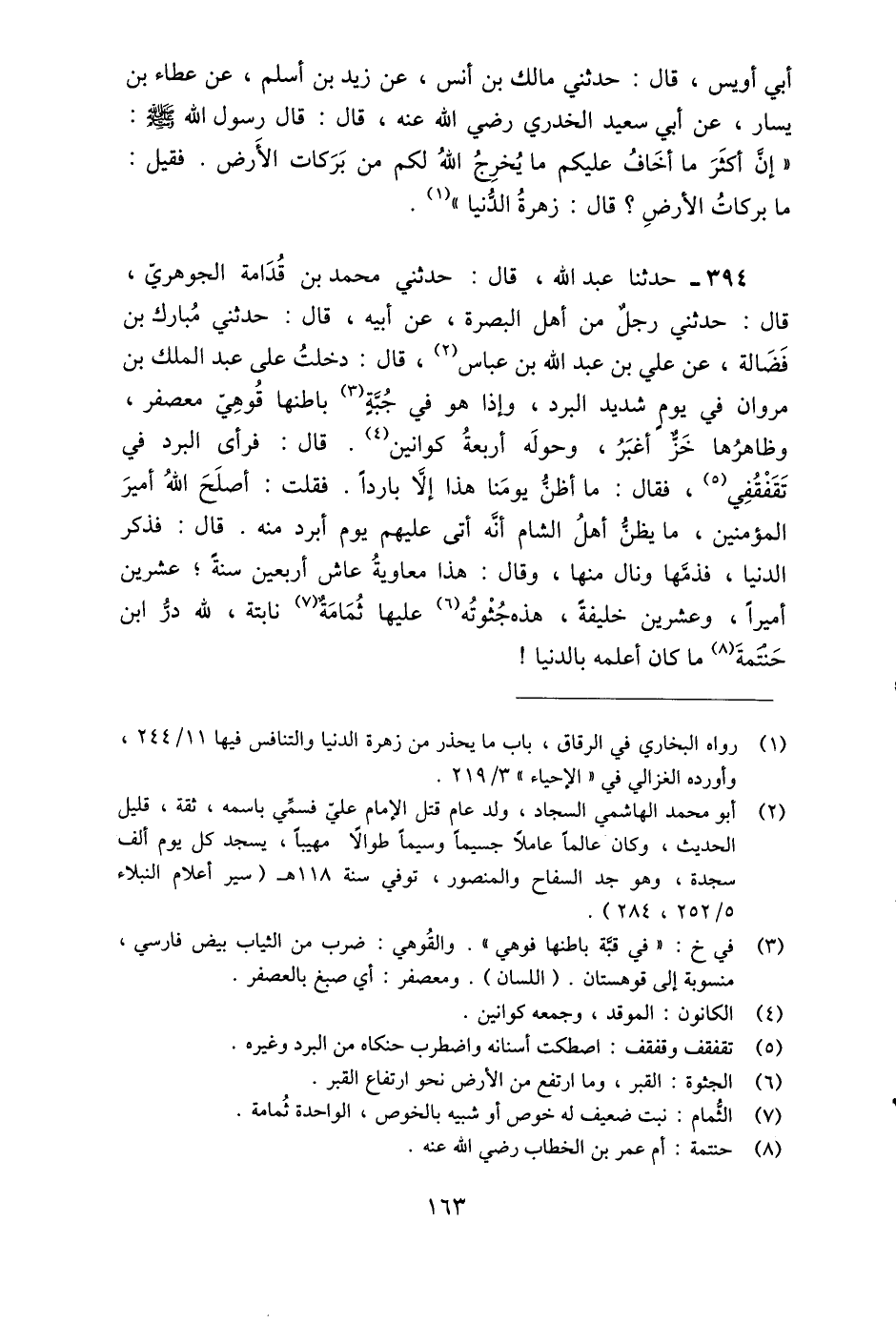 352 - حَدَّثَنِي مُحَمَّدُ بْنُ قُدَامَةَ الْجَوْهَرِيُّ، قَالَ: حَدَّثَنِي رَجُلٌ مِنْ أَهْلِ الْبَصْرَةِ، عَنْ أَبِيهِ، قَالَ: حَدَّثَنِي مُبَارَكُ بْنُ فَضَالَةَ، عَنْ عَلِيِّ بْنِ عَبْدِ اللَّهِ بْنِ عَبَّاسٍ، قَالَ: دَخَلْتُ عَلَى عَبْدِ الْمَلِكِ بْنِ مَرْوَانَ فِي يَوْمٍ شَدِيدِ الْبَرْدِ، وَإِذَا هُوَ فِي جُبَّةٍ بَاطِنُهَا قُوهِيٌّ مُعَصْفَرٌ، وَظَاهِرُهَا خَزٌّ أَغْبَرُ، وَحَوْلَهُ أَرْبَعَةُ كَوَانِينَ، قَالَ: فَرَأَى الْبَرْدَ فِي تَقَفْقُفِي، فَقَالَ: مَا أَظُنُّ يَوْمَنَا هَذَا إِلَّا بَارِدًا، فَقُلْتُ: أَصْلَحَ اللَّهُ أَمِيرَ الْمُؤْمِنِينَ، مَا يَظُنُّ أَهْلُ الشَّامِ أَنَّهُ أَتَى عَلَيْهِمْ يَوْمٌ أَبْرَدُ مِنْهُ. قَالَ: فَذَكَرَ الدُّنْيَا، فَذَمَّهَا وَنَالَ مِنْهَا، وَقَالَ: هَذَا §مُعَاوِيَةُ عَاشَ أَرْبَعِينَ سَنَةً، عِشْرِينَ أَمِيرًا، وَعِشْرِينَ خَلِيفَةً، هَذِهِ جُثْوتُهُ عَلَيْهَا ثُمَامَةٌ نَابِتَةٌ، لِلَّهِ دَرُّ ابْنِ حَنْتَمَةَ مَا كَانَ أَعْلَمَهُ بِالدُّنْيَا "