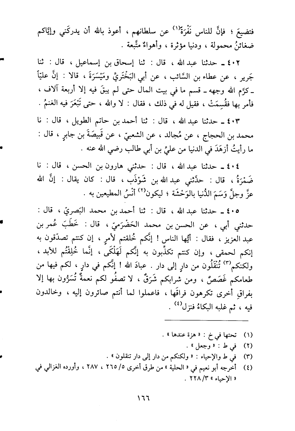 363 - ثنا أَحْمَدُ بْنُ مُحَمَّدٍ الْبَصْرِيُّ، قَالَ: حَدَّثَنِي أَبِي، عَنِ الْحَسَنِ بْنِ مُحَمَّدٍ الْحَضْرَمِيِّ، قَالَ: خَطَبَ عُمَرُ بْنُ عَبْدِ الْعَزِيزِ فَقَالَ: «أَيُّهَا النَّاسُ إِنَّكُمْ §خُلِقْتُمْ لِأَمْرٍ، إِنْ كُنْتُمْ تُصَدِّقُونَ بِهِ إِنَّكُمْ لَحَمْقَى، وَإِنْ كُنْتُمْ تُكَذِّبُونَ بِهِ إِنَّكُمْ لَهَلْكَى، إِنَّمَا خُلِقْتُمْ لِلْأَبَدِ، وَلَكِنَّكُمْ تُنْقَلُونَ مِنْ دَارٍ إِلَى دَارٍ، عِبَادَ اللَّهِ إِنَّكُمْ فِي دَارٍ لَكُمْ فِيهَا مِنْ طَعَامِكُمْ غَصَصٌ، وَمِنْ شَرَابِكُمْ شَرَقٌ، لَا تَصْفُو لَكُمْ نِعْمَةٌ تُسَرُّونَ بِهَا إِلَّا بِفِرَاقِ أُخْرَى تَكْرَهُونَ فِرَاقَهَا، فَاعْمَلُوا لِمَا أَنْتُمْ صَائِرُونَ إِلَيْهِ، وَخَالِدُونَ فِيهِ» ، ثُمَّ غَلَبَهُ الْبُكَاءُ فَنَزَلَ