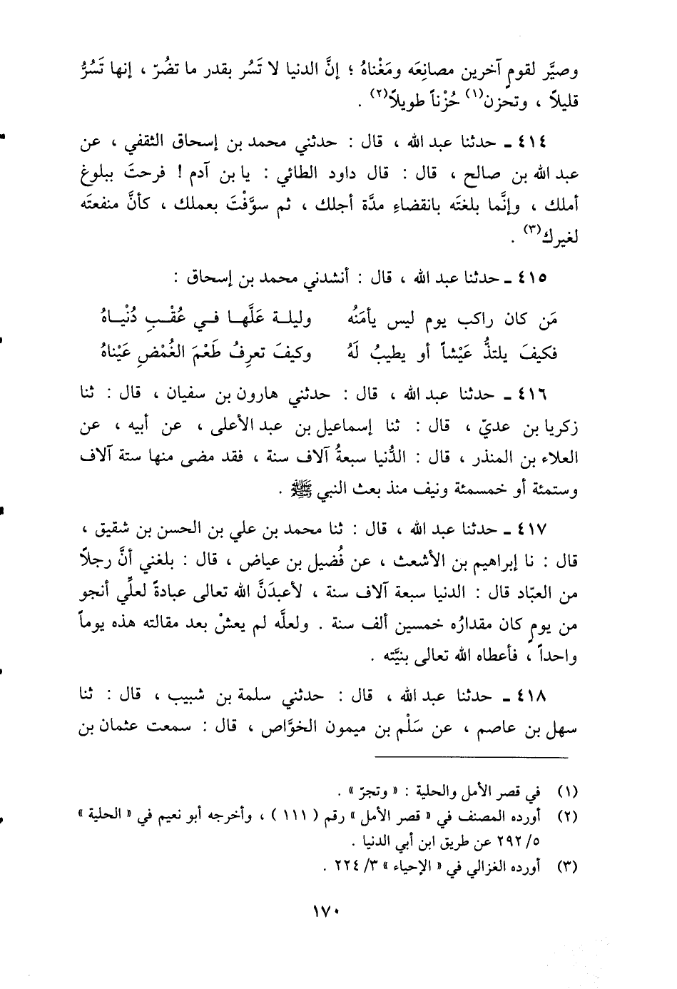 371 - حَدَّثَنِي مُحَمَّدُ بْنُ إِسْحَاقَ الثَّقَفِيُّ، عَنْ عَبْدِ اللَّهِ بْنِ صَالِحٍ، قَالَ: قَالَ دَاوُدُ الطَّائِيُّ: «يَا ابْنَ آدَمَ §فَرِحْتَ بِبُلُوغِ أَمَلِكَ، وَإِنَّمَا بَلَغْتَهُ بِانْقِضَاءِ مُدَّةِ أَجَلِكَ، ثُمَّ سَوَّفْتَ بِعَمَلِكَ، كَأَنَّ مَنْفَعَتَهُ لِغَيْرِكَ» أَنْشَدَنِي مُحَمَّدُ بْنُ إِسْحَاقَ: