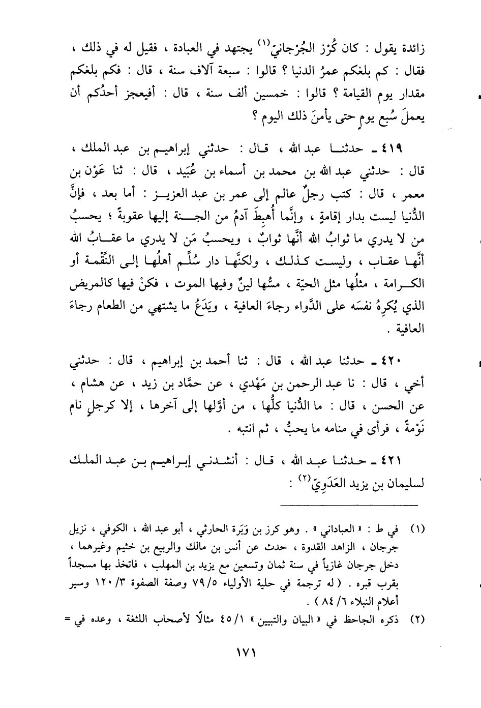 376 - ثنا أَحْمَدُ بْنُ إِبْرَاهِيمَ، قَالَ: حَدَّثَنِي أَخِي، قَالَ: نا عَبْدُ الرَّحْمَنِ بْنُ مَهْدِيٍّ، عَنْ حَمَّادِ بْنِ زَيْدٍ، عَنْ هِشَامٍ، عَنِ الْحَسَنِ، قَالَ: §مَا الدُّنْيَا كُلُّهَا مِنْ أَوَّلِهَا إِلَى آخِرِهَا، إِلَّا كَرَجُلٍ نَامَ نَوْمَةً فَرَأَى فِي مَنَامِهِ مَا يُحِبُّ، ثُمَّ انْتَبَهَ أَنْشَدَنِي إِبْرَاهِيمُ بْنُ عَبْدِ الْمَلِكِ لِسُلَيْمَانَ بْنِ يَزِيدَ الْعَدَوِيِّ: -[172]-