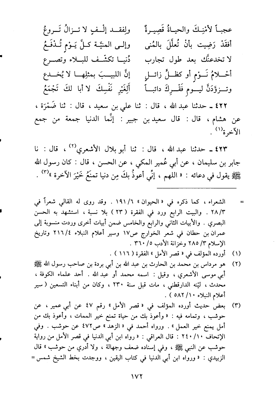 378 - ثنا أَبُو بِلَالٍ الْأَشْعَرِيُّ، قَالَ: نا جَابِرُ بْنُ سُلَيْمَانَ، عَنْ أَبِي عُمَيْرٍ الْمَكِّيِّ، عَنِ الْحَسَنِ، قَالَ: كَانَ رَسُولُ اللَّهِ صَلَّى اللَّهُ عَلَيْهِ وَسَلَّمَ يَقُولُ فِي دُعَائِهِ: «اللَّهُمَّ إِنِّي §أَعُوذُ بِكَ مِنْ دُنْيَا تَمْنَعُ خَيْرَ الْآخِرَةِ»