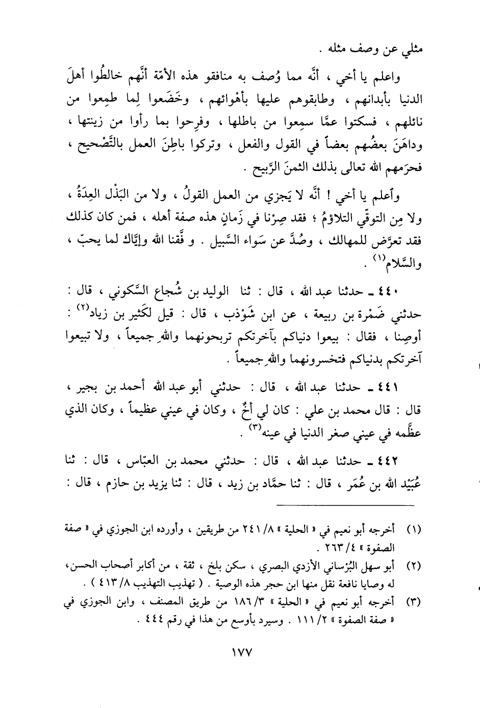 393 - ثنا الْوَلِيدُ بْنُ شُجَاعٍ السَّكُونِيُّ، قَالَ: حَدَّثَنِي ضَمْرَةُ بْنُ رَبِيعَةَ، عَنِ ابْنِ شَوْذَبٍ، قَالَ: قِيلَ لَكَثِيرِ بْنِ زِيَادٍ: أَوْصِنَا، فَقَالَ: §بِيعُوا دُنْيَاكُمْ بِآخِرَتِكُمْ تَرْبَحُونَهُمَا - وَاللَّهِ جَمِيعًا، وَلَا تَبِيعُوا آخِرَتَكُمْ بِدُنْيَاكُمْ فَتَخْسِرُونَهُمَا وَاللَّهِ جَمِيعًا "