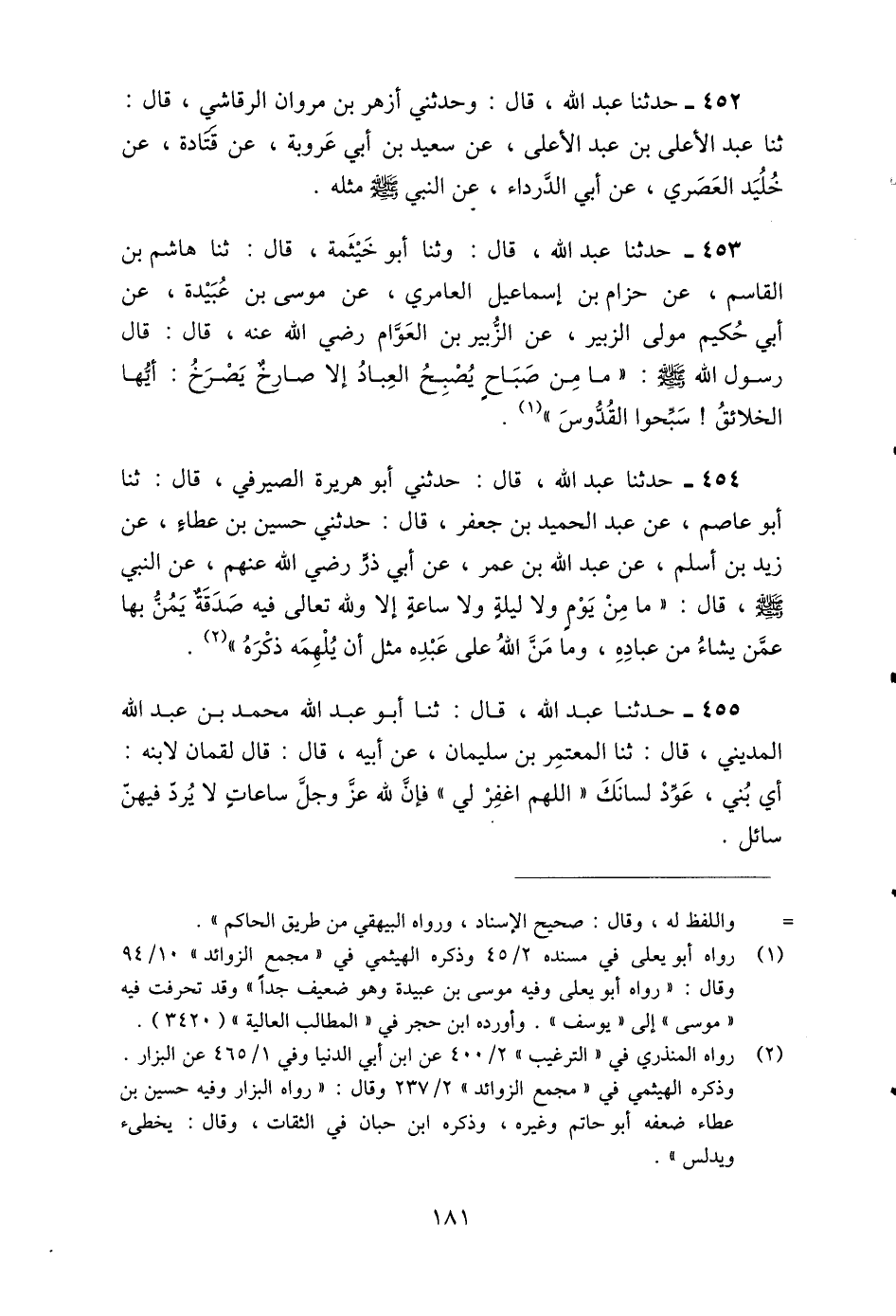 404 - وَثَنَا أَبُو خَيْثَمَةَ، قَالَ: ثنا هَاشِمُ بْنُ الْقَاسِمِ، عَنْ حِزَامِ بْنِ إِسْمَاعِيلَ الْعَامِرِيِّ، عَنْ مُوسَى بْنِ عُبَيْدَةَ، عَنْ أَبِي حَكِيمٍ، مَوْلَى الزُّبَيْرِ، عَنِ الزُّبَيْرِ بْنِ الْعَوَّامِ رَضِيَ اللَّهُ عَنْهُ قَالَ: قَالَ رَسُولُ اللَّهِ صَلَّى اللَّهُ عَلَيْهِ وَسَلَّمَ: " §مَا مِنْ صَبَاحٍ يُصْبِحُ الْعِبَادُ إِلَّا صَارِخٌ يَصْرُخُ: أَيُّهَا الْخَلَائِقُ سَبِّحُوا الْقُدُّوسَ