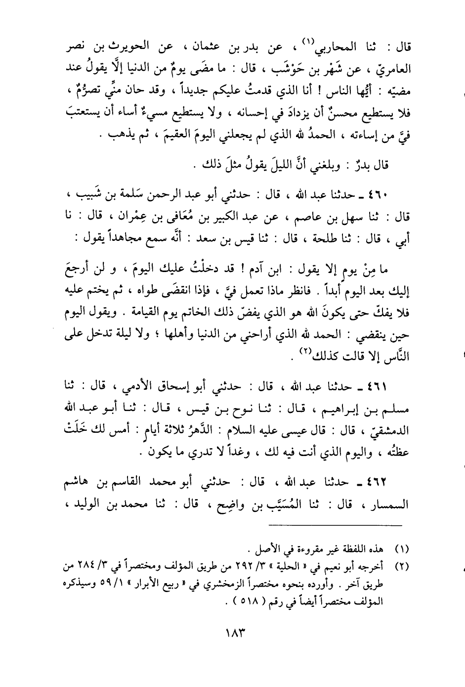 411 - حَدَّثَنِي أَبُو عَبْدِ الرَّحْمَنِ سَلَمَةُ بْنُ شَبِيبٍ قَالَ: ثنا سَهْلُ بْنُ عَاصِمٍ، عَنْ عَبْدِ الْكَبِيرِ بْنِ مُعَافَى بْنِ عِمْرَانَ، قَالَ: نا أَبِي قَالَ: ثنا قَيْسُ بْنُ سَعْدٍ، أَنَّهُ سَمِعَ مُجَاهِدًا يَقُولُ: " §مَا مِنْ يَوْمٍ إِلَّا يَقُولُ: ابْنَ آدَمَ قَدْ دَخَلْتُ عَلَيْكَ الْيَوْمَ، وَلَنْ أَرْجِعَ إِلَيْكَ بَعْدَ الْيَوْمِ أَبَدًا، فَانْظُرْ مَاذَا تَعْمَلُ فِيَّ، فَإِذَا انْقَضَى طَوَاهُ، ثُمَّ يُخْتَمُ عَلَيْهِ فَلَا يُفَكُّ حَتَّى يَكُونَ اللَّهُ هُوَ الَّذِي يَفُضُّ ذَلِكَ الْخَاتَمَ يَوْمَ الْقِيَامَةِ، وَيَقُولُ الْيَوْمُ حِينَ يَنْقَضِي: الْحَمْدُ لِلَّهِ الَّذِي أَرَاحَنِي مِنَ الدُّنْيَا وَأَهْلِهَا، وَلَا لَيْلَةٌ تَدْخُلُ عَلَى النَّاسِ إِلَّا قَالَتْ كَذَلِكَ