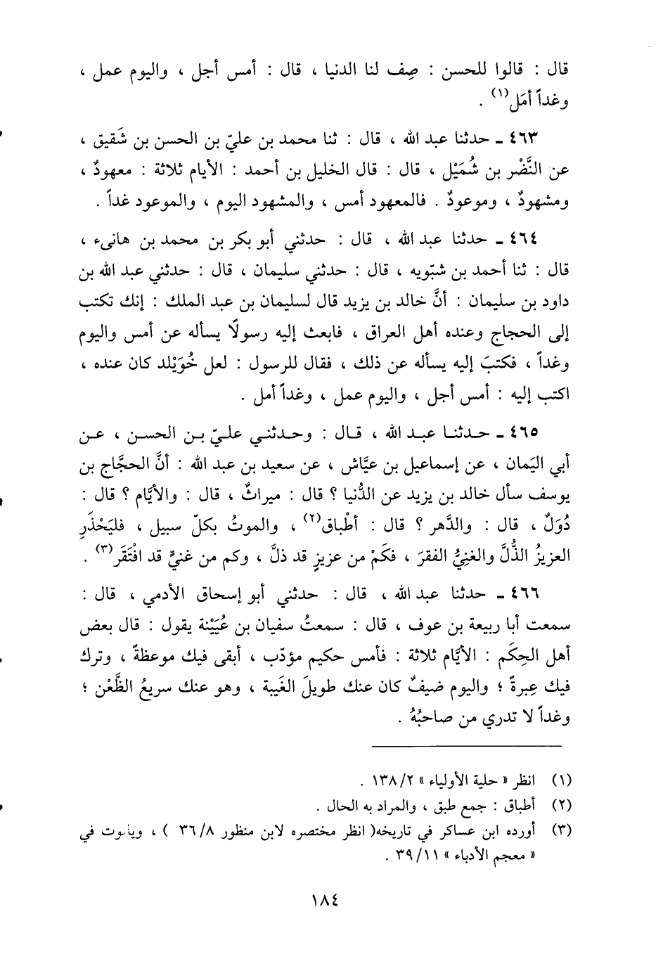415 - حَدَّثَنِي أَبُو بَكْرِ بْنُ مُحَمَّدِ بْنِ هَانِئٍ، قَالَ: ثنا أَحْمَدُ بْنُ شَبُّوَيْهِ، قَالَ: حَدَّثَنِي سُلَيْمَانُ، قَالَ: حَدَّثَنِي عَبْدُ اللَّهِ عَنْ دَاوُدَ بْنِ سُلَيْمَانَ، أَنَّ خَالِدَ بْنَ يَزِيدَ، قَالَ لِسُلَيْمَانَ بْنِ عَبْدِ الْمَلِكِ: إِنَّكَ تَكْتُبُ إِلَى الْحَجَّاجِ وَعِنْدَهُ أَهْلُ الْعِرَاقِ، فَكَتَبَ إِلَيْهِ يَسْأَلُهُ عَنْ ذَلِكَ فَقَالَ لِلرَّسُولِ: " لَعَلَّ خُوَيْلِدًا كَانَ عِنْدَهُ، اكْتُبْ إِلَيْهِ: §أَمْسِ أَجَلٌ، وَالْيَوْمُ عَمَلٌ، وَغَدٌ أَمَلٌ