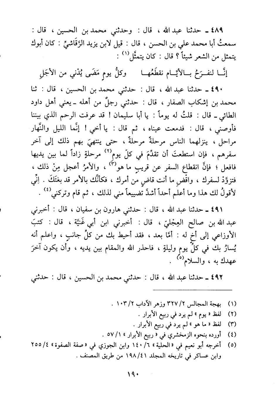 440 - حَدَّثَنِي مُحَمَّدُ بْنُ الْحُسَيْنِ، قَالَ: ثنا مُحَمَّدُ بْنُ إِشْكَابَ الصَّفَّارُ، قَالَ: حَدَّثَنِي رَجُلٌ مِنْ أَهْلِهِ يَعْنِي أَهْلَ دَاوُدَ الطَّائِيِّ قَالَ: قُلْتُ لَهُ يَوْمًا: يَا أَبَا سُلَيْمَانَ قَدْ عَرَفْتَ الرَّحِمَ الَّذِي بَيْنَنَا فَأَوْصِنِي قَالَ: فَدَمَعَتْ عَيْنَاهُ، ثُمَّ قَالَ: يَا أَخِي إِنَّمَا §اللَّيْلُ وَالنَّهَارُ مَرَاحِلُ، يَنْزِلُهُمَا النَّاسُ مَرْحَلَةً مَرْحَلَةً، حَتَّى يَنْتَهِيَ بِهِمْ ذَلِكَ إِلَى آخِرِ سَفَرِهِمْ، فَإِنِ اسْتَطَعْتَ أَنْ تُقَدِّمَ فِي كُلِّ يَوْمِ مَرْحَلَةٍ زَادًا لِمَا بَيْنَ يَدَيْهَا فَافْعَلْ، فَإِنَّ انْقِطَاعَ السَّفَرِ عَنْ قَرِيبٍ مَا هُوَ، وَالْأَمْرُ أَعْجَلُ مِنْ ذَلِكَ، فَتَزَوَّدْ لِسَفَرِكَ، وَاقْضِ مَا أَنْتَ قَاضٍ مِنْ أَمْرِكَ، فَكَأَنَّكَ بِالْأَمْرِ قَدْ بَغَتَكَ، إِنِّي لَأَقُولُ لَكَ هَذَا وَمَا أَعْلَمُ أَحَدًا أَشَدَّ تَضْيِيعًا مِنِّي لِذَلِكَ "، ثُمَّ قَامَ وَتَرَكَنِي