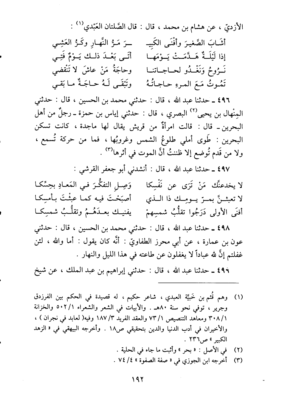 446 - حَدَّثَنِي مُحَمَّدُ بْنُ الْحُسَيْنِ، قَالَ: حَدَّثَنِي الْمِنْهَالُ بْنُ يَحْيَى الْبَصْرِيُّ، قَالَ: حَدَّثَنِي إِيَاسُ بْنُ حَمْزَةَ، رَجُلٌ مِنْ أَهْلِ الْبَحْرَيْنِ قَالَ: قَالَتِ امْرَأَةٌ مِنْ قُرَيْشٍ يُقَالُ لَهَا مَاجِدَةُ، كَانَتْ تَسْكُنُ الْبَحْرَيْنِ: " §طَوَى أَمَلِي طُلُوعُ الشَّمْسِ وَغُرُوبُهَا، فَمَا مِنْ حَرَكَةٍ تُسْمَعُ، وَلَا مِنْ قَدَمٍ تُوضَعُ إِلَّا ظَنَنْتُ أَنَّ الْمَوْتَ فِي أَثَرِهَا. أَنْشَدَنِي أَبُو جَعْفَرٍ الْقُرَشِيُّ:
