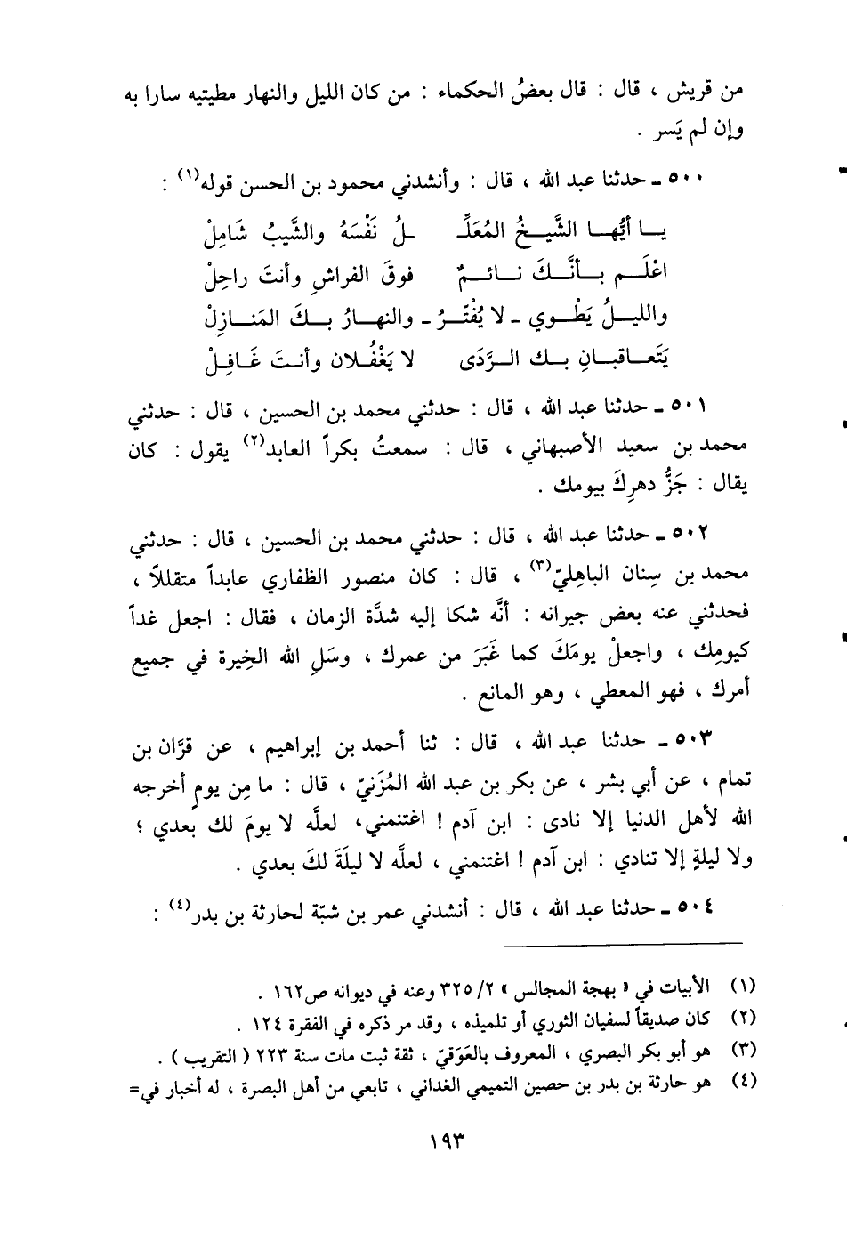 449 - حَدَّثَنِي مُحَمَّدُ بْنُ الْحُسَيْنِ، قَالَ: حَدَّثَنِي مُحَمَّدُ بْنُ سَعِيدٍ الْأَصْبَهَانِيُّ، قَالَ: سَمِعْتُ بَكْرًا الْعَابِدَ، يَقُولُ: كَانَ يُقَالُ: §جَزُّ دَهْرِكَ بِيَوْمِكَ