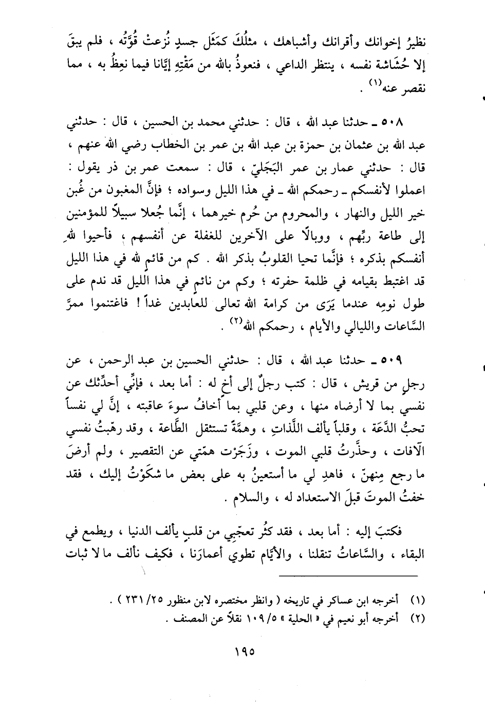 454 - حَدَّثَنِي مُحَمَّدُ بْنُ الْحُسَيْنِ، قَالَ: حَدَّثَنِي عَبْدُ اللَّهِ بْنُ عُثْمَانَ بْنِ حَمْزَةَ بْنِ عَبْدِ اللَّهِ بْنِ عُمَرَ بْنِ الْخَطَّابِ، رَضِيَ اللَّهُ عَنْهُمْ قَالَ: حَدَّثَنِي عَمَّارُ بْنُ عُمَرَ الْبَجَلِيُّ، قَالَ: سَمِعْتُ عُمَرَ بْنَ ذَرٍّ، يَقُولُ: اعْمَلُوا لِأَنْفُسِكُمْ رَحِمَكُمُ اللَّهُ فِي هَذَا اللَّيْلِ وَسَوَادِهِ، فَإِنَّ §الْمَغْبُونَ مَنْ غُبِنَ خَيْرَ اللَّيْلِ وَالنَّهَارِ، وَالْمَحْرُومَ مَنْ حُرِمَ خَيْرُهُمَا، إِنَّمَا جُعِلَا سَبِيلًا لِلْمُؤْمِنِينَ إِلَى طَاعَةِ رَبِّهِمْ، وَوَبَالًا عَلَى الْآخَرِينَ لِلْغَفْلَةِ عَنْ أَنْفُسِهِمْ، فَأَحْيُوا لِلَّهِ أَنْفُسَكُمْ بِذِكْرِهِ، فَإِنَّمَا تَحْيَا الْقُلُوبُ بِذِكْرِ اللَّهِ، كَمْ مِنْ قَائِمٍ لِلَّهِ فِي هَذَا اللَّيْلِ قَدِ اغْتَبَطَ بِقِيَامِهِ فِي ظُلْمَةِ حُفْرَتِهِ، وَكَمْ مِنْ نَائِمٍ فِي هَذَا اللَّيْلِ قَدْ نَدِمَ عَلَى طُولِ نَوْمِهِ عِنْدَمَا يَرَى مِنْ كَرَامَةِ اللَّهِ تَعَالَى لِلْعَابِدِينَ غَدًا، فَاغْتَنِمُوا مَمَرَّ السَّاعَاتِ وَاللَّيَالِي وَالْأَيَّامِ، رَحِمَكُمُ اللَّهُ