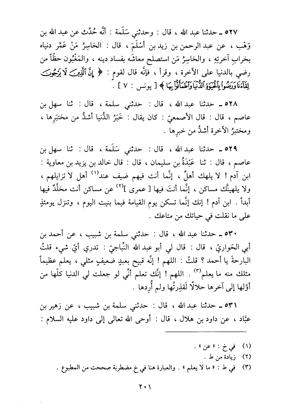 471 - حَدَّثَنِي سَلَمَةُ، قَالَ: ثنا سَهْلُ بْنُ عَاصِمٍ، قَالَ: ثنا عَبْدَةُ بْنُ سُلَيْمَانَ، قَالَ: قَالَ خَالِدُ بْنُ يَزِيدَ بْنِ مُعَاوِيَةَ: ابْنَ آدَمَ لَا يَلْهِكَ أَهْلٌ، إِنَّمَا §أَنْتَ فِيهِمْ ضَيْفٌ عِنْدَ أَهْلٍ لَا تُزَايِلُهُمْ، وَلَا يَلْهِيَنَّكَ مَسَاكِنُ، إِنَّمَا أَنْتَ فِيهَا عُمْرَى عَنْ مَسَاكِنَ أَنْتَ مُخَلَّدٌ فِيهَا أَبَدًا، ابْنَ آدَمَ إِنَّكَ إِنَّمَا تَسْكُنُ يَوْمَ الْقِيَامَةِ فِيمَا بَنَيْتَ الْيَوْمَ، وَتَنْزِلُ يَوْمَئِذٍ عَلَى مَا نَقَلْتَ فِي حَيَاتِكَ مِنْ مَتَاعِكَ