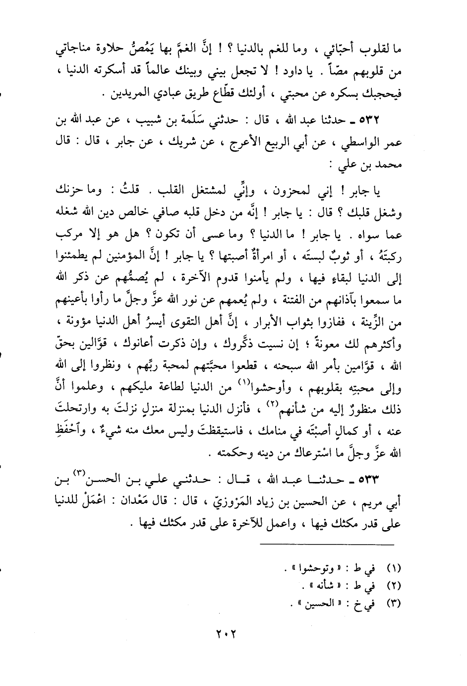 474 - حَدَّثَنِي سَلَمَةُ بْنُ شَبِيبٍ، عَنْ عَبْدِ اللَّهِ بْنِ عُمَرَ الْوَاسِطِيِّ، عَنْ أَبِي الرَّبِيعِ الْأَعْرَجِ، عَنْ شَرِيكٍ، عَنْ جَابِرٍ، قَالَ: قَالَ مُحَمَّدُ بْنُ عَلِيٍّ: يَا جَابِرُ إِنِّي لَمَحْزُونٌ، وَإِنِّي لَمُشْتَغِلُ الْقَلْبِ، قُلْتُ: وَمَا حُزْنُكَ وَشُغْلُ قَلْبِكَ؟ قَالَ: يَا جَابِرُ إِنَّهُ §مَنْ دَخَلَ قَلْبَهُ صَافِي خَالِصُ دِينِ اللَّهِ شَغَلَهُ عَمَّا سِوَاهُ، يَا جَابِرُ مَا الدُّنْيَا؟ وَمَا عَسَى أَنْ تَكُونَ؟ هَلْ هُوَ إِلَّا مَرْكِبٌ رَكِبْتَهُ، أَوْ ثَوْبٌ لَبِسْتَهُ، أَوِ امْرَأَةٌ أَصَبْتَهَا؟ يَا جَابِرُ إِنَّ الْمُؤْمِنِينَ لَمْ يَطْمَئِنُّوا إِلَى الدُّنْيَا لِبَقَاءٍ فِيهَا، وَلَمْ يَأْمَنُوا قُدُومَ الْآخِرَةِ، لَمْ يُصِمُّهُمْ عَنْ ذِكْرِ اللَّهِ مَا سَمِعُوا بِآذَانِهِمْ مِنَ الْفِتْنَةِ، وَلَمْ يُعْمِهِمْ عَنْ نُورِ اللَّهِ عَزَّ وَجَلَّ مَا رَأَوْا بِأَعْيُنِهِمْ مِنَ الزِّينَةِ، فَفَازُوا بِثَوَابِ الْأَبْرَارِ، إِنَّ أَهْلَ التَّقْوَى أَيْسَرُ أَهْلِ الدُّنْيَا مَؤُونَةً، وَأَكْثَرُهُمْ لَكَ مَعُونَةً، إِنْ نَسِيتَ ذَكَّرُوكَ، وَإِنْ ذَكَرْتَ أَعَانُوكَ، قَوَّالِينَ بِحَقِّ اللَّهِ، قَوَّامِينَ بِأَمْرِ اللَّهِ سُبْحَانَهُ، قَطَعُوا مَحَبَّتَهُمْ لِمَحَبَّةِ رَبِّهِمْ، وَنَظَرُوا إِلَى اللَّهِ وَإِلَى مَحَبَّتِهِ بِقُلُوبِهِمْ، وَأَوْحَشُوا مِنَ الدُّنْيَا لِطَاعَةِ مَلِيكِهِمْ، وَعَلِمُوا أَنَّ ذَلِكَ مَنْظُورٌ إِلَيْهِ مِنْ شَأْنِهِمْ، فَأَنْزِلِ الدُّنْيَا بِمَنْزِلَةِ مَنْزِلٍ نَزَلْتَ بِهِ وَارْتَحَلْتَ عَنْهُ، أَوْ كَمَالٍ أَصَبْتَهُ فِي مَنَامِكَ، فَاسْتَيْقَظْتَ وَلَيْسَ مِنْهُ شَيْءٌ، وَاحْفَظِ اللَّهَ عَزَّ وَجَلَّ مَا اسْتَرْعَاكَ مِنْ دِينِهِ وَحِكْمَتِهِ
