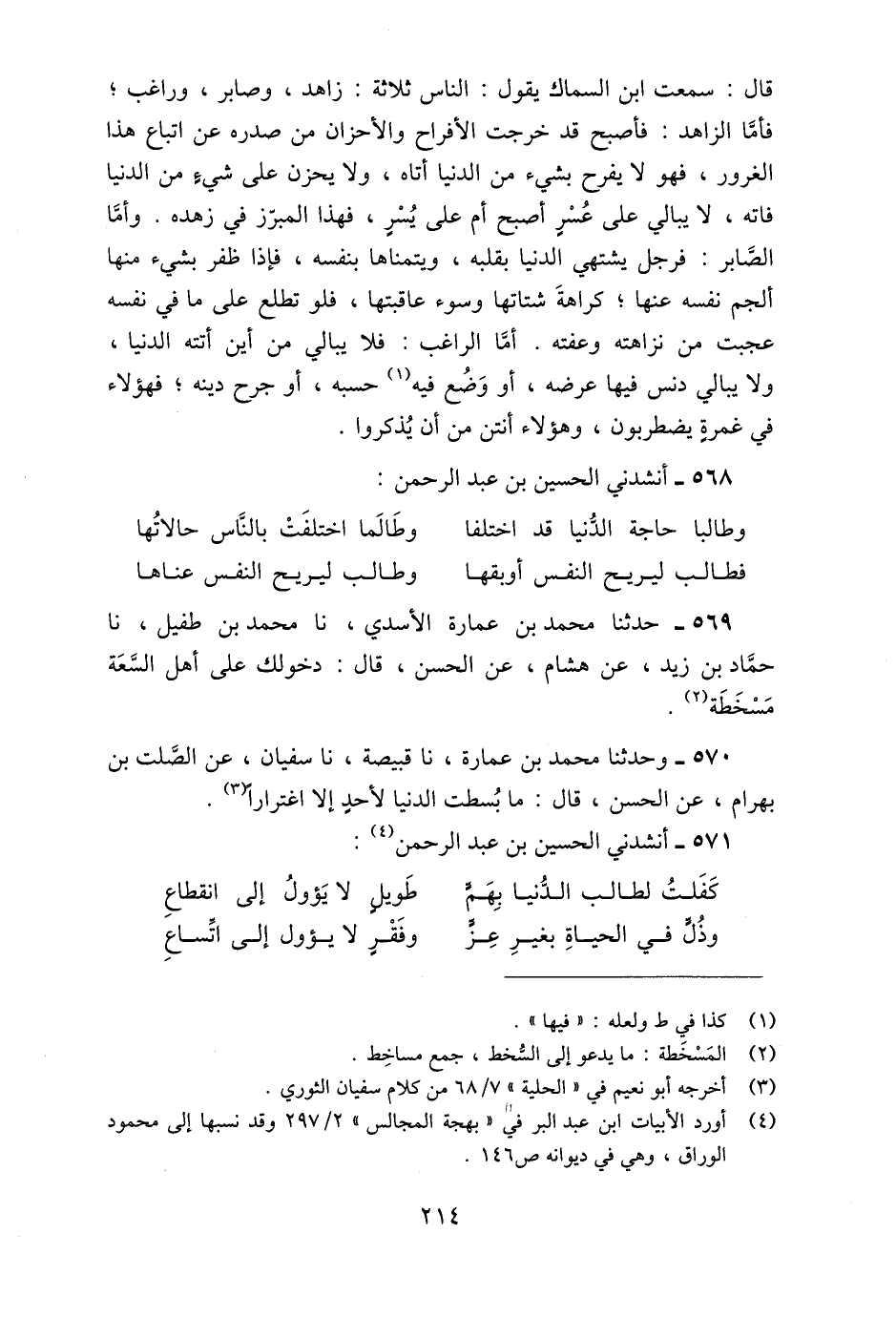 503 - وَحَدَّثَنَا مُحَمَّدُ بْنُ عُمَارَةَ، نا قَبِيصَةُ، نا سُفْيَانُ، عَنِ الصَّلْتِ بْنِ بَهْرَامَ، عَنِ الْحَسَنِ، قَالَ: «§مَا بُسِطَتِ الدُّنْيَا لِأَحَدٍ إِلَّا اغْتِرَارًا» أَنْشَدَنِي الْحُسَيْنُ بْنُ عَبْدِ الرَّحْمَنِ: