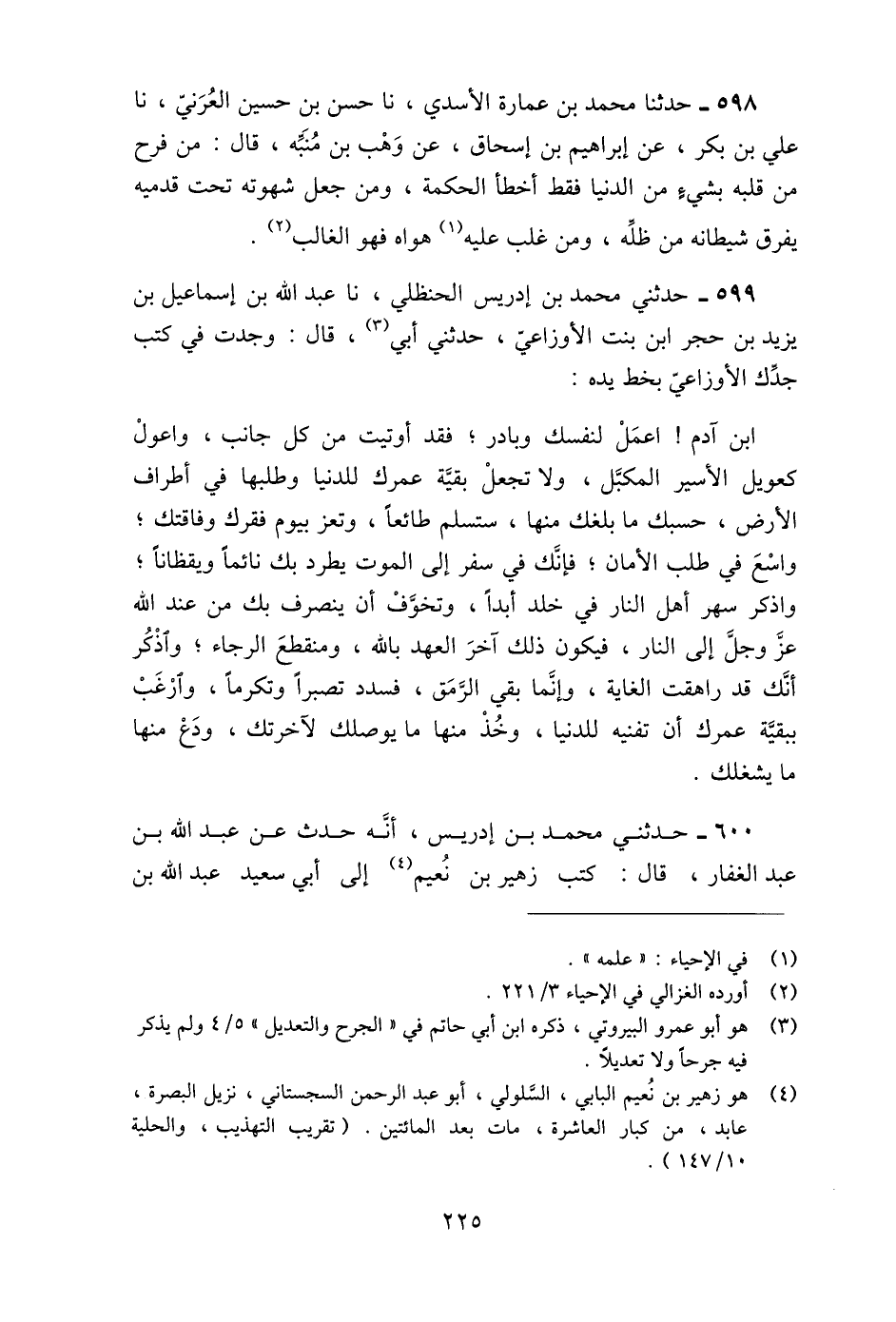 525 - حَدَّثَنِي مُحَمَّدُ بْنُ إِدْرِيسَ الْحَنْظَلِيُّ، نا عَبْدُ اللَّهِ بْنُ إِسْمَاعِيلَ بْنِ يَزِيدَ بْنِ حُجْرِ ابْنُ بِنْتِ الْأَوْزَاعِيِّ، حَدَّثَنِي أَبِي قَالَ: وَجَدْتُ فِي كُتُبِ جَدِّكَ الْأَوْزَاعِيِّ بِخَطِّ يَدِهِ: «ابْنَ آدَمَ §اعْمَلْ لِنَفْسِكَ وَبَادِرْ، فَقَدْ أُوتِيتَ مِنْ كُلِّ جَانِبٍ، وَاعْوِلْ كَعَوِيلِ الْأَسِيرِ الْمُكَبَّلِ، وَلَا تَجْعَلْ بَقِيَّةَ عُمُرِكَ لِلدُّنْيَا وَطَلَبِهَا فِي أَطْرَافِ الْأَرْضِ، حَسْبُكَ مَا بَلَغَكَ مِنْهَا، سَتُسَلِّمُ طَائِعًا، وَتَعَزَّ بِيَوْمِ فَقْرِكَ وَفَاقَتِكَ، وَاذْكُرْ سَهَرَ أَهْلِ النَّارِ فِي خُلْدٍ أَبَدًا، وَتَخَوَّفْ أَنْ يُنْصَرَفَ بِكَ مِنْ عِنْدِ اللَّهِ عَزَّ وَجَلَّ إِلَى النَّارِ، فَيَكُونُ ذَلِكَ آخِرَ الْعَهْدِ بِاللَّهِ، وَمُنْقَطَعَ الرَّجَاءِ، وَاذْكُرْ أَنَّكَ قَدْ رَاهَقْتَ الْغَايَةَ، وَإِنَّمَا بَقِيَ الرَّمَقُ، فَسَدِّدْ تَصَبُّرًا وَتَكَرُّمًا، وَارْغَبْ بِبَقِيَّةِ عُمُرِكَ أَنْ تُفْنِيهِ لِلدُّنْيَا، وَخُذْ مِنْهَا مَا يُوصِلُكَ لِآخِرَتِكَ، وَدَعْ مِنْهَا مَا يَشْغَلُكَ»