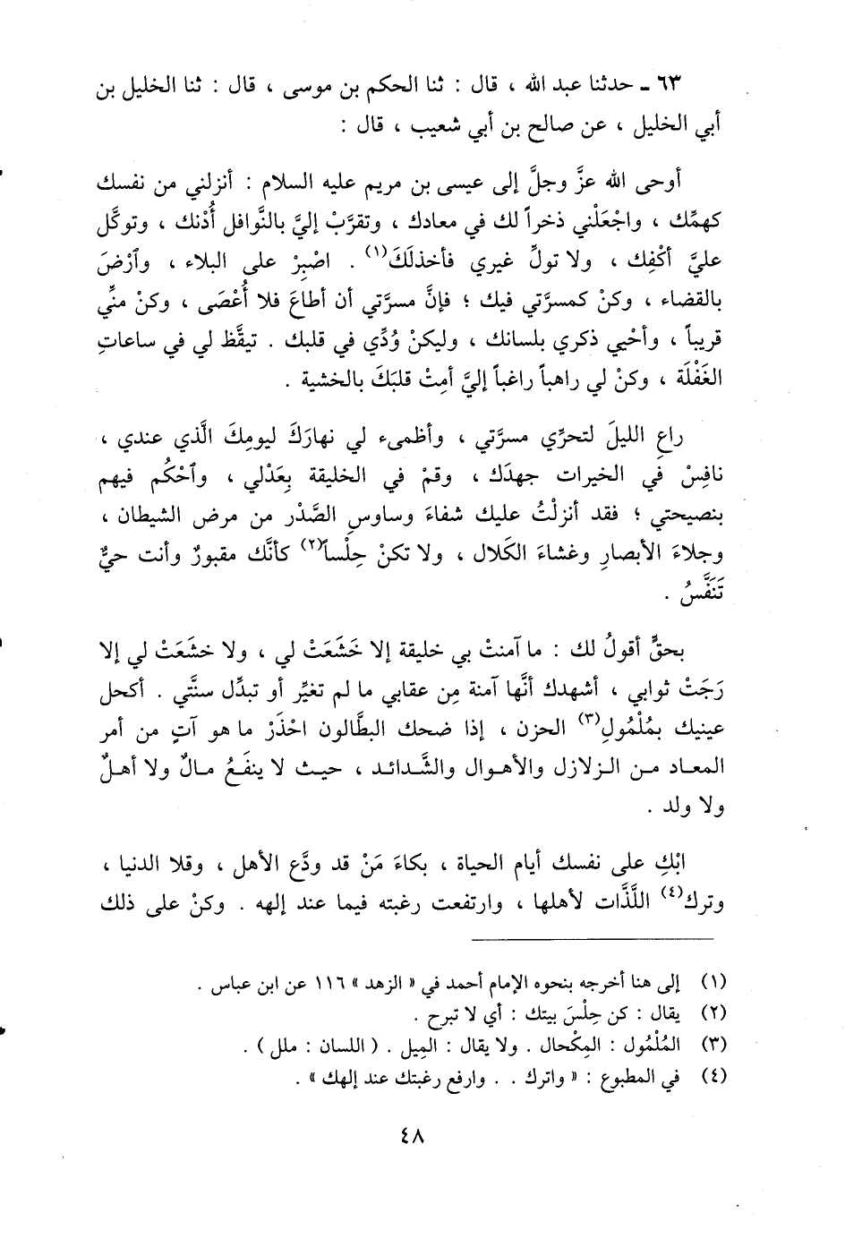 63 - ثنا الْحَكَمُ بْنُ مُوسَى، قَالَ: ثنا الْخَلِيلُ بْنُ أَبِي الْخَلِيلِ، عَنْ صَالِحِ بْنِ أَبِي شُعَيْبٍ، قَالَ: أَوْحَى اللَّهُ عَزَّ وَجَلَّ إِلَى عِيسَى ابْنِ مَرْيَمَ عَلَيْهِ السَّلَامُ: §أَنْزَلَنِي مِنْ نَفْسِكَ كَهَمِّكَ، وَاجْعَلْنِي ذُخْرًا لَكَ فِي مَعَادِكَ، وَتَقَرَّبْ إِلَيَّ بِالنَّوَافِلِ أُدْنِكَ، وَتَوَكَّلْ عَليَّ أَكْفِكَ، وَلَا تَوَلَّ غَيْرِي فَأَخْذُلَكَ. اصْبِرْ عَلَى الْبَلَاءِ، وَارْضَ بِالْقَضَاءِ، وَكُنْ كَمَسَرَّتِي فِيكَ، فَإِنَّ مَسَرَّتِي أَنْ أُطَاعَ فَلَا أُعْصَى، وَكُنْ مِنِّي قَرِيبًا، وَأَحْيِي ذِكْرِي بِلِسَانِكَ، وَلْيَكُنْ وُدِّي فِي قَلْبِكَ. تَيَقَّظْ لِي فِي سَاعَاتِ الْغَفْلَةِ، وَكُنْ لِي رَاهِبًا رَاغِبًا إِلَيَّ أَمِتْ قَلْبَكَ بِالْخَشْيَةِ " رَاعِ اللَّيْلَ لِتَحَرِّي مَسَرَّتِي، وَأَظْمِئْ لِي نَهَارَكَ لِيَوْمِكَ الَّذِي عِنْدِي، نَافِسْ فِي الْخَيْرَاتِ جَهْدَكَ، وَقُمْ فِي الْخَلِيقَةِ بِعَدْلِي، وَاحْكُمْ فِيهِمْ بِنَصِيحَتِي، فَقَدْ أَنْزَلْتُ عَلَيْكَ شِفَاءَ وَسَاوِسِ الصَّدْرِ مِنْ مَرَضِ الشَّيْطَانِ وَجِلَاءِ الْأَبْصَارِ وَغِشَاءِ الْكَلَالِ، وَلَا تَكُنْ حِلْسًا كَأَنَّكَ مَقْبُورٌ وَأَنْتَ حَيٌّ تَنَفَّسُ، بِحَقٍّ أَقُولُ لَكَ: مَا آمَنَتْ بِي خَلِيفَةٌ إِلَّا خَشَعَتْ لِي، وَلَا خَشَعَتْ لِي إِلَّا رَجَتْ ثَوَابِي، أُشْهِدُكَ أَنَّهَا آمِنَةٌ مِنْ عِقَابِي مَا لَمْ تُغَيِّرْ أَوْ تُبَدِّلْ سُنَّتِي، أَكْحِلْ عَيْنَيْكَ بِمُلْمُولِ الْحُزْنِ، إِذَا ضَحِكَ الْبَطَّالُونَ احْذَرْ مَا هُوَ آتٍ مِنْ أَمْرِ الْمَعَادِ مِنَ الزَّلَازِلِ وَالْأَهْوَالِ وَالشَّدَائِدِ، حَيْثُ لَا يَنْفَعُ مَالٌ وَلَا أَهْلٌ وَلَا وَلَدٌ، ابْكِ عَلَى نَفْسِكَ أَيَّامَ الْحَيَاةِ بُكَاءَ مَنْ قَدْ وَدَّعَ الْأَهْلَ، وَقَلَا الدُّنْيَا وَتَرَكَ اللَّذَّاتِ لِأَهْلِهَا، وَارْتَفَعَتْ رَغْبَتُهُ فِيمَا عِنْدَ إِلَهِهِ، وَكُنْ عَلَى ذَلِكَ -[49]- صَابِرًا مُحْتَسِبًا، طُوبَى لَكَ إِنْ نَالَكَ مَا وَعَدْتُ الصَّابِرِينَ. تَرَجَّ مِنَ الدُّنْيَا يَوْمًا بِيَوْمٍ، وَارْضَ مِنْهَا بِالْبُلْغَةِ، وَلْيَكْفِكَ مِنْهَا الْخَشِنُ. ذُقْ مَذَاقَةَ مَا قَدْ ذَهَبَ مِنْكَ أَيْنَ طَعْمُهُ؟ وَمَا لَمْ يَأْتِكَ أَيْنَ لَذَّتُهُ؟ لَوْ رَأَتْ عَيْنُكَ مَا أَعْدَدْتُ لِأَوْلِيَائِي الصَّالِحِينَ لَذَابَ قَلْبُكَ، وَزَهَقَتْ نَفْسُكَ اشْتِيَاقًا إِلَيْهِ "