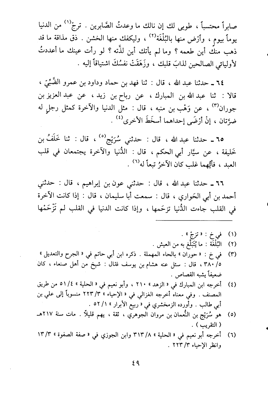 64 - ثنا فَهْدُ بْنُ حَمَّادٍ، وَدَاوُدُ بْنُ عَمْرٍو الضَّبِّيُّ، قَالَا: ثنا عَبْدُ اللَّهِ بْنُ الْمُبَارَكِ، عَنْ رَبَاحِ بْنِ زَيْدٍ، عَنْ عَبْدِ الْعَزِيزِ بْنِ جَوْرَانَ، عَنْ وَهْبِ بْنِ مُنَبِّهٍ، قَالَ: §مَثَلُ الدُّنْيَا وَالْآخِرَةِ كَمَثَلِ رَجُلٍ لَهُ ضَرَّتَانِ، إِنْ أَرْضَى إِحْدَاهُمَا أَسْخَطَ الْأُخْرَى