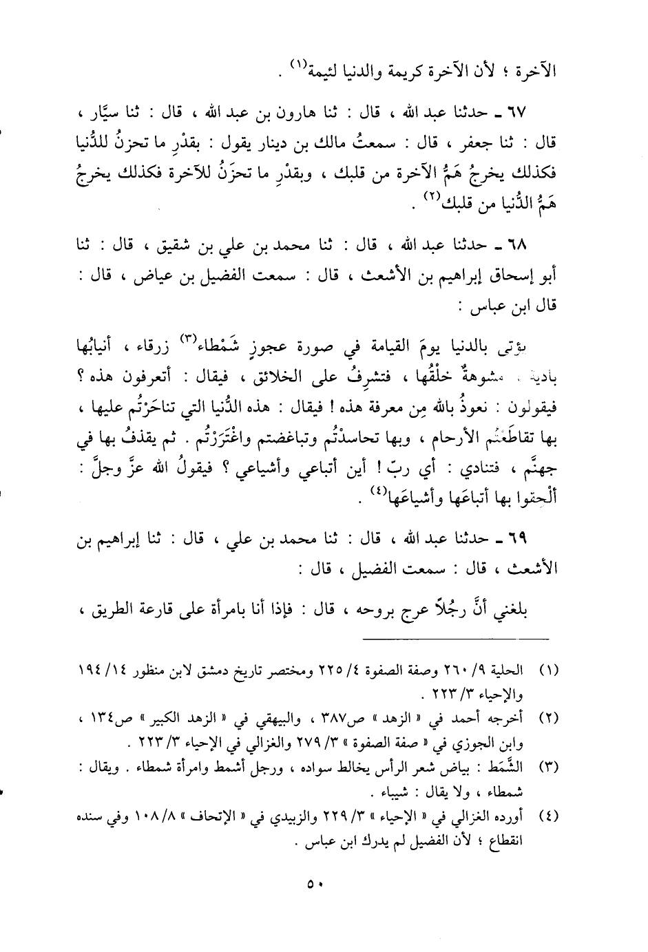 69 - ثنا مُحَمَّدُ بْنُ عَلِيٍّ، قَالَ: ثنا إِبْرَاهِيمُ بْنُ الْأَشْعَثِ، قَالَ: سَمِعْتُ الْفُضَيْلَ، قَالَ: بَلَغَنِي أَنَّ رَجُلًا عُرِجَ بِرُوحِهِ قَالَ: فَإِذَا أَنَا بِامْرَأَةٍ عَلَى قَارِعَةِ الطَّرِيقِ، -[51]- عَلَيْهَا مِنْ كُلِّ زِينَةٍ مِنَ الْحُلِيِّ وَالثِّيَابِ، وَإِذَا هِيَ لَا يَمُرُّ بِهَا أَحَدٌ إِلَّا جَرَّحَتْهُ، فَإِذَا هِيَ أَدْبَرَتْ كَانَتْ أَحْسَنَ شَيْءٍ رَآهَا النَّاسُ، فَإِذَا أَقْبَلَتْ كَانَتْ أَقْبَحَ شَيْءٍ رَآهَا النَّاسُ، عَجُوزٌ شَمْطَاءُ زَرْقَاءُ عَمْشَاءُ. قَالَ: فَقُلْتُ: أَعُوذُ بِاللَّهِ مِنْكِ قَالَتْ: لَا وَاللَّهِ، §لَا يُعِيذُكَ اللَّهُ مِنِّي حَتَّى تُبْغِضَ الدِّرْهَمَ. قَالَ: قُلْتُ: مَنْ أَنْتِ؟ قَالَتْ: أَمَا تَعْرِفُنِي؟ قُلْتُ لَا. قَالَتْ: أَنَا الدُّنْيَا "