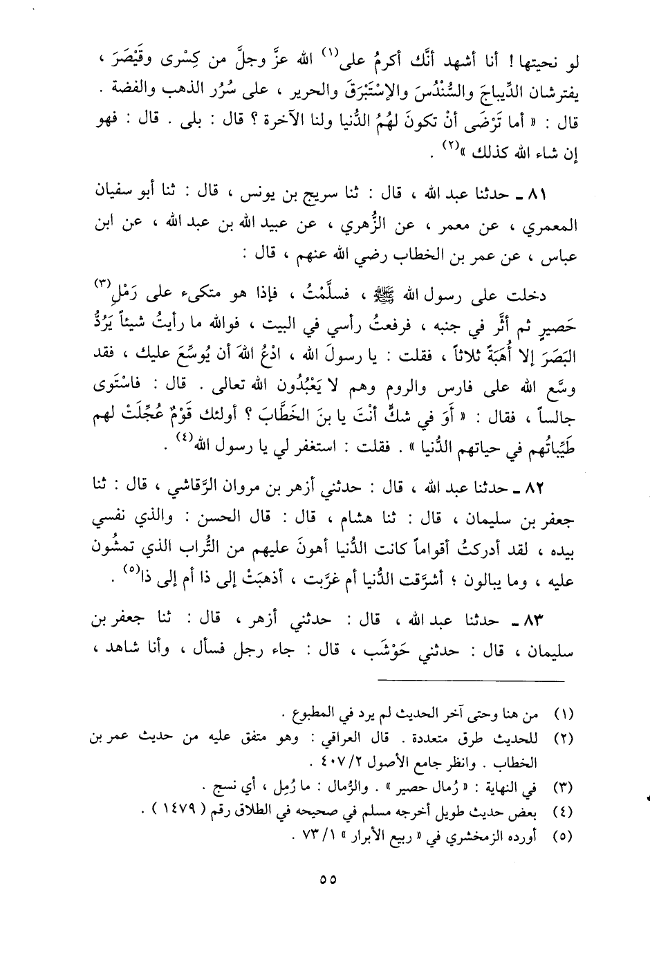 81 - ثنا سُرَيْجُ بْنُ يُونُسَ، قَالَ: ثنا أَبُو سُفْيَانَ الْمَعْمَرِيُّ، عَنْ مَعْمَرٍ، عَنِ الزُّهْرِيِّ، عَنْ عُبَيْدِ اللَّهِ بْنِ عَبْدِ اللَّهِ، عَنِ ابْنِ عَبَّاسٍ، عَنْ عُمَرَ بْنِ الْخَطَّابِ، رَضِيَ اللَّهُ عَنْهُمْ قَالَ: دَخَلْتُ عَلَى رَسُولِ اللَّهِ صَلَّى اللَّهُ عَلَيْهِ وَسَلَّمَ، فَسَلَّمْتُ، فَإِذَا هُوَ مُتَّكِئٌ عَلَى رَمْلِ حَصِيرٍ ثُمَّ أَثَّرَ فِي جَنْبِهِ، فَرَفَعْتُ رَأْسِي فِي الْبَيْتِ فَوَاللَّهِ §مَا رَأَيْتُ شَيْئًا يَرُدُّ الْبَصَرَ إِلَّا أُهَبَةً ثَلَاثًا، فَقُلْتُ: يَا رَسُولَ اللَّهِ، ادْعُ اللَّهَ أَنْ يُوَسِّعَ عَلَيْكَ، فَقَدْ وَسَّعَ اللَّهُ عَلَى فَارِسَ وَالرُّومِ وَهُمْ لَا يَعْبُدُونَ اللَّهَ تَعَالَى. قَالَ: فَاسْتَوَى جَالِسًا، فَقَالَ: «أَوَفِي شَكٍّ أَنْتَ يَا ابْنَ الْخَطَّابِ؟ أُولَئِكَ قَوْمٌ عُجِّلَتْ لَهُمْ طَيِّبَاتُهُمْ فِي حَيَاتِهِمُ الدُّنْيَا» ، فَقُلْتُ: اسْتَغْفِرْ لِي يَا رَسُولَ اللَّهِ "