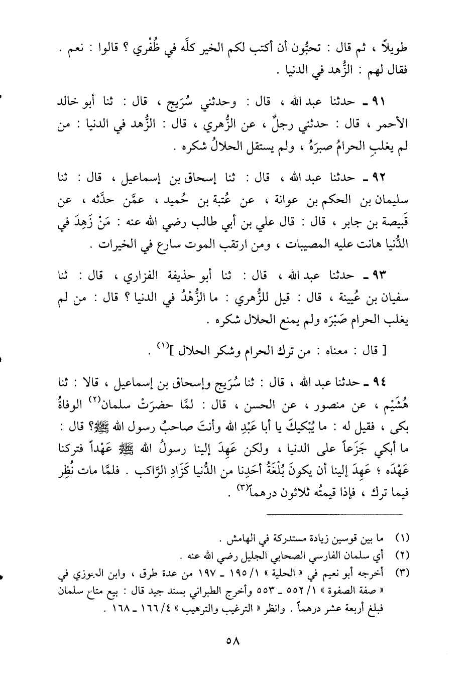93 - ثنا أَبُو حُذَيْفَةَ الْفَزَارِيُّ، قَالَ: ثنا سُفْيَانُ بْنُ عُيَيْنَةَ، قَالَ: قِيلَ لِلزُّهْرِيِّ: مَا الزُّهْدُ فِي الدُّنْيَا؟ قَالَ: §مَنْ لَمْ يَغْلِبِ الْحَرَامُ صَبْرَهُ، وَلَمْ يَمْنَعِ الْحَلَالُ شُكْرَهُ، قَالَ: مَعْنَاهُ: مَنْ تَرَكَ الْحَرَامَ، وَشَكَرَ الْحَلَالَ