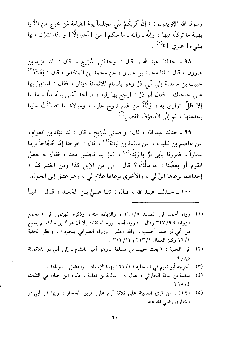 98 - وَحَدَّثَنِي سُرَيْجٌ، قَالَ: ثنا يَزِيدُ بْنُ هَارُونَ، قَالَ: ثنا مُحَمَّدُ بْنُ عَمْرٍو، عَنْ مُحَمَّدِ بْنِ الْمُنْكَدِرِ، قَالَ: بَعَثَ حَبِيبُ بْنُ مَسْلَمَةَ إِلَى أَبِي ذَرٍّ وَهُوَ بِالشَّامِ ثَلَاثَمِائَةِ دِينَارٍ، فَقَالَ أَبُو ذَرٍّ: ارْجِعْ بِهَا إِلَيْهِ، §مَا أَحَدٌ أَغْنَى بِاللَّهِ مِنَّا، مَا لَنَا إِلَّا ظِلٌّ نَتَوَارَى بِهِ، وَثُلَّةٌ مِنْ غَنَمٍ تَرُوحُ عَلَيْنَا، وَمَوْلَاةٌ لَنَا تَصَدَّقَتْ عَلَيْنَا بِخِدْمَتِهَا، ثُمَّ إِنِّي لَأَتَخَوَّفُ الْفَضْلَ