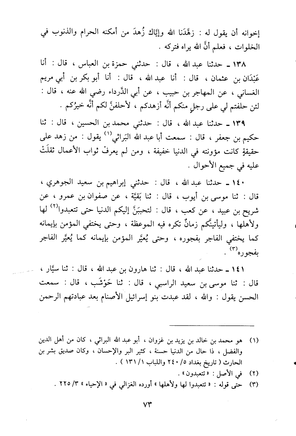 139 - حَدَّثَنِي مُحَمَّدُ بْنُ الْحُسَيْنِ، قَالَ: ثنا حَكِيمُ بْنُ جَعْفَرٍ، قَالَ: سَمِعْتُ أَبَا عَبْدِ اللَّهِ الْبَرَاثِيَّ، يَقُولُ: §مَنْ زَهِدَ عَلَى حَقِيقَةٍ كَانَتْ مَؤُونَتُهُ فِي الدُّنْيَا خَفِيفَةً، وَمَنْ لَمْ يَعْرِفْ ثَوَابَ الْأَعْمَالِ ثَقُلَتْ عَلَيْهِ فِي جَمِيعِ الْأَحْوَالِ