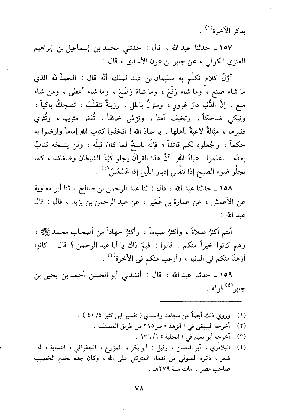 157 - حَدَّثَنِي مُحَمَّدُ بْنُ إِسْمَاعِيلَ بْنِ إِبْرَاهِيمَ الْعَنَزِيُّ الْكُوفِيُّ، عَنْ جَابِرِ بْنِ عَوْنٍ الْأَسَدِيِّ، قَالَ: أَوَّلُ كَلَامٍ تَكَلَّمَ بِهِ سُلَيْمَانُ بْنُ عَبْدِ الْمَلِكِ أَنَّهُ قَالَ: الْحَمْدُ لِلَّهِ الَّذِي §مَا شَاءَ صَنَعَ، وَمَا شَاءَ رَفَعَ، وَمَا شَاءَ وَضَعَ، وَمَا شَاءَ أَعْطَى، وَمَنْ شَاءَ مَنَعَ، إِنَّ الدُّنْيَا دَارُ غُرُورٍ، وَمُنْزِلٌ بَاطِلٌ، وَزِينَةٌ تَتَقَلَّبُ، تُضْحِكُ بَاكِيًا وَتُبْكِي ضَاحِكًا، وَتُخِيفُ آمِنًا، وَتُؤَمِّنُ خَائِفًا، تُفْقِرُ مُثْرِيهَا، وَتُثْرِي فَقِيرَهَا، مَيَّالَةٌ لَاعِبَةٌ بِأَهْلِهَا. يَا عِبَادَ اللَّهِ اتَّخِذُوا كِتَابَ اللَّهِ إِمَامًا وَارْضُوا بِهِ حُكْمًا، وَاجْعَلُوهُ لَكُمْ قَائِدًا، فَإِنَّهُ نَاسِخٌ لِمَا كَانَ قَبْلَهُ، وَلَنْ يَنْسَخَهُ كِتَابٌ بَعْدَهُ، اعْلَمُوا عِبَادَ اللَّهِ أَنَّ هَذَا الْقُرْآنَ يَجْلُو كَيْدَ الشَّيْطَانِ وَضَغَائِنَهُ، كَمَا يَجْلُو ضَوْءُ الصُّبْحِ إِذَا تَنَفَّسَ إِدْبَارَ اللَّيْلِ إِذَا عَسْعَسَ