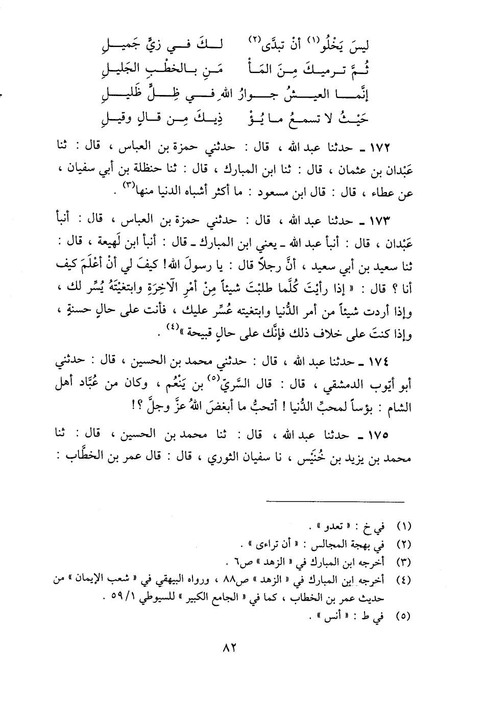174 - ثنا مُحَمَّدُ بْنُ الْحُسَيْنِ، قَالَ: ثنا مُحَمَّدُ بْنُ يَزِيدَ بْنِ خُنَيْسٍ، نا سُفْيَانُ الثَّوْرِيُّ، قَالَ: قَالَ عُمَرُ بْنُ الْخَطَّابِ: -[83]- " §لَا تَحْزَنْ أَنْ يُعَجَّلَ لَكَ كَثِيرٌ مِمَّا تُحِبُّ مِنْ أَمْرِ دُنْيَاكَ إِذَا كُنْتَ ذَا رَغْبَةٍ فِي أَمْرِ آخِرَتِكَ حَدَّثَنَا عَبْدُ اللَّهِ، قَالَ: أَنْشَدَنِي أَحْمَدُ بْنُ مُوسَى الثَّقَفِيُّ:
