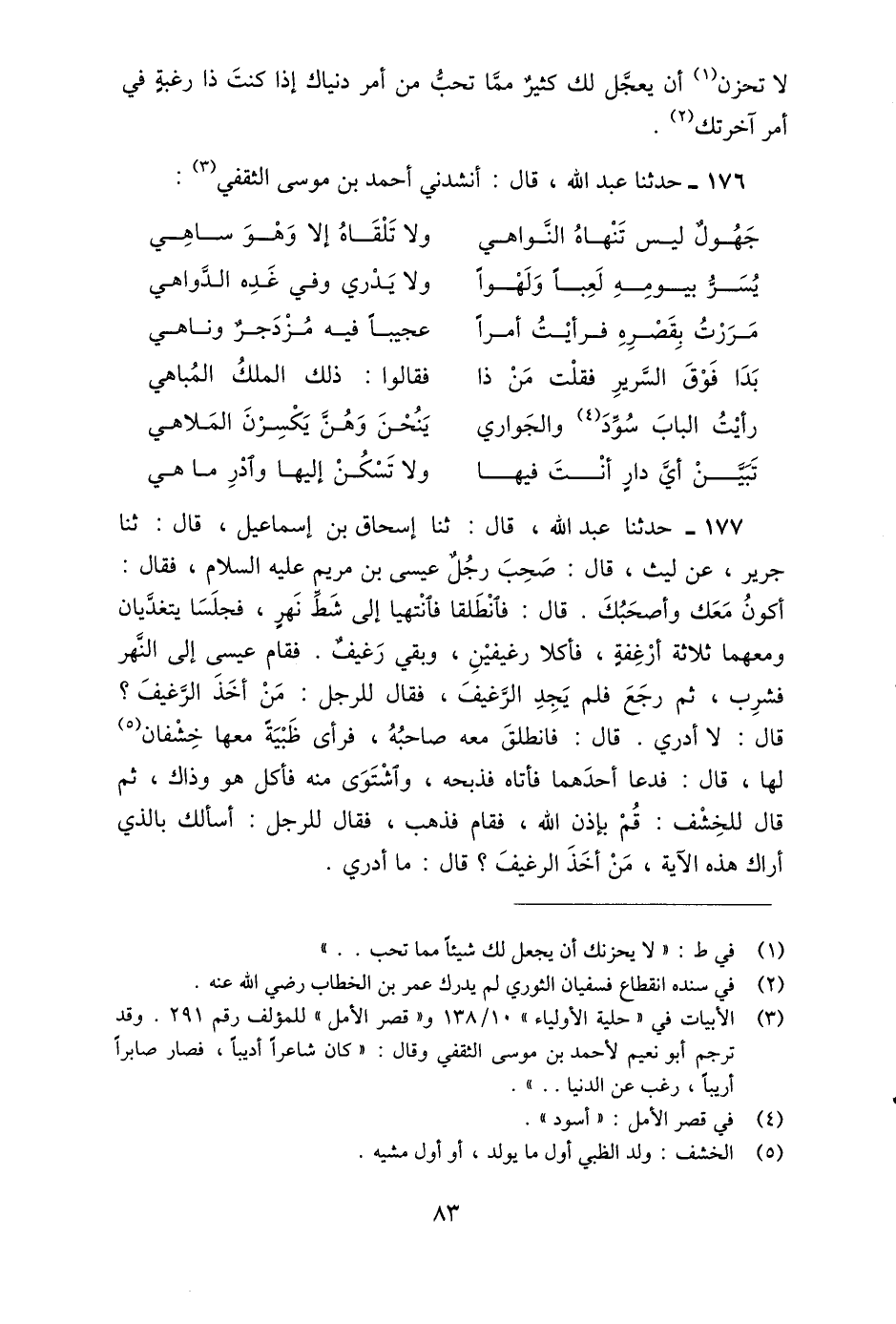 175 - حَدَّثَنَا عَبْدُ اللَّهِ قَالَ: ثنا إِسْحَاقُ بْنُ إِسْمَاعِيلَ، قَالَ: ثنا جَرِيرٌ، عَنْ لَيْثٍ، قَالَ: صَحِبَ رَجُلٌ عِيسَى ابْنَ مَرْيَمَ عَلَيْهِ السَّلَامُ، فَقَالَ: أَكُونُ مَعَكَ وَأَصْحَبُكَ قَالَ: فَانْطَلَقَا فَانْتَهَيَا إِلَى شَطِّ نَهَرٍ، فَجَلَسَا يَتَغَدَّيَانِ وَمَعَهُمَا ثَلَاثَةُ أَرْغِفَةٍ، فَأَكَلَا رَغِيفَيْنِ، وَبَقِيَ رَغِيفٌ، فَقَامَ عِيسَى إِلَى النَّهَرِ فَشَرِبَ، ثُمَّ رَجَعَ فَلَمْ يَجِدِ الرَّغِيفَ، فَقَالَ لِلرَّجُلِ: «مَنْ أَخَذَ الرَّغِيفَ؟» قَالَ: لَا أَدْرِي قَالَ: فَانْطَلَقَ مَعَهُ صَاحِبُهُ، فَرَأَى ظَبْيَةَ مَعَهَا خِشْفَانِ لَهَا قَالَ: فَدَعَا أَحَدَهُمَا فَأَتَاهُ فَذَبَحَهُ، وَاشْتَوَى مِنْهُ فَأَكَلَ هُوَ وَذَاكَ، ثُمَّ قَالَ لِلْخِشْفِ: قُمْ بِإِذْنِ اللَّهِ، فَقَامَ فَذَهَبَ، فَقَالَ لِلرَّجُلِ: أَسْأَلُكَ بِالَّذِي أَرَاكَ هَذِهِ الْآيَةَ §مَنْ أَخَذَ الرَّغِيفَ؟ قَالَ: مَا أَدْرِي. -[84]- قَالَ: ثُمَّ انْتَهَيَا إِلَى وَادِي مَاءٍ، فَأَخَذَ عِيسَى بِيَدِ الرَّجُلِ فَمَشَيَا عَلَى الْمَاءِ، فَلَمَّا جَاوَزَا قَالَ: أَسْأَلُكَ بِالَّذِي أَرَاكَ هَذِهِ الْآيَةَ، مَنْ أَخَذَ الرَّغِيفَ؟ قَالَ: لَا أَدْرِي. قَالَ: فَانْتَهَيَا إِلَى مَفَازَةٍ فَجَلَسَا، فَأَخَذَ عِيسَى فَجَمَعَ تُرَابًا، أَوْ كَثِيبًا، ثُمَّ قَالَ: كُنْ ذَهَبًا بِإِذْنِ اللَّهِ، فَصَارَ ذَهَبًا، فَقَسَّمَهُ ثَلَاثَةَ أَثْلَاثٍ، فَقَالَ: ثُلُثٌ لِي، وَثُلُثٌ لَكَ، وَثُلُثٌ لِمَنْ أَخَذَ الرَّغِيفَ فَقَالَ: أَنَا أَخَذْتُ الرَّغِيفَ قَالَ: فَكُلُّهُ لَكَ، قَالَ: وَفَارَقَهُ عِيسَى، فَانْتَهَى إِلَيْهِ رَجُلَانِ فِي الْمَفَازَةِ وَمَعَهُ الْمَالُ، فَأَرَادَا أَنْ يَأْخُذَاهُ مِنْهُ، وَيَقْتُلَاهُ، فَقَالَ: هُوَ بَيْنَنَا أَثْلَاثًا. قَالَ: فَابْعَثُوا أَحَدَكُمْ إِلَى الْقَرْيَةِ حَتَّى يَشْتَرِيَ طَعَامًا قَالَ: فَبَعَثُوا أَحَدَهُمْ. قَالَ: فَقَالَ الَّذِي بُعِثَ: لِأَيِّ شَيْءٍ أُقَاسِمُهُمَا هَذَا الْمَالَ؟ وَلَكِنِّي أَصْنَعُ فِي هَذَا الطَّعَامِ سُمًّا فَأَقْتُلُهُمَا. قَالَ: فَفَعَلَ. وَقَالَ ذَانِكَ: لِأَيِّ شَيْءٍ نَجْعَلُ لِهَذَا ثُلُثَ الْمَالِ؟ وَلَكِنْ إِذَا رَجَعَ إِلَيْنَا قَتَلْنَاهُ، وَاقْتَسَمْنَاهُ بَيْنَنَا قَالَ: فَلَمَّا رَجَعَ إِلَيْهِمَا قَتَلَاهُ، وَأَكَلَا الطَّعَامَ، فَمَاتَا , قَالَ: فَبَقِيَ ذَلِكَ الْمَالُ فِي الْمَفَازَةِ، وَأُولَئِكَ الثَّلَاثَةُ قَتْلَى عِنْدَهُ " وَفِي غَيْرِ حَدِيثِ إِسْحَاقَ بْنِ إِسْمَاعِيلَ قَالَ: فَمَرَّ بِهِمْ عِيسَى عَلَى تِلْكَ الْحَالِ، فَقَالَ لِأَصْحَابِهِ: هَذِهِ الدُّنْيَا فَاحْذَرُوهَا