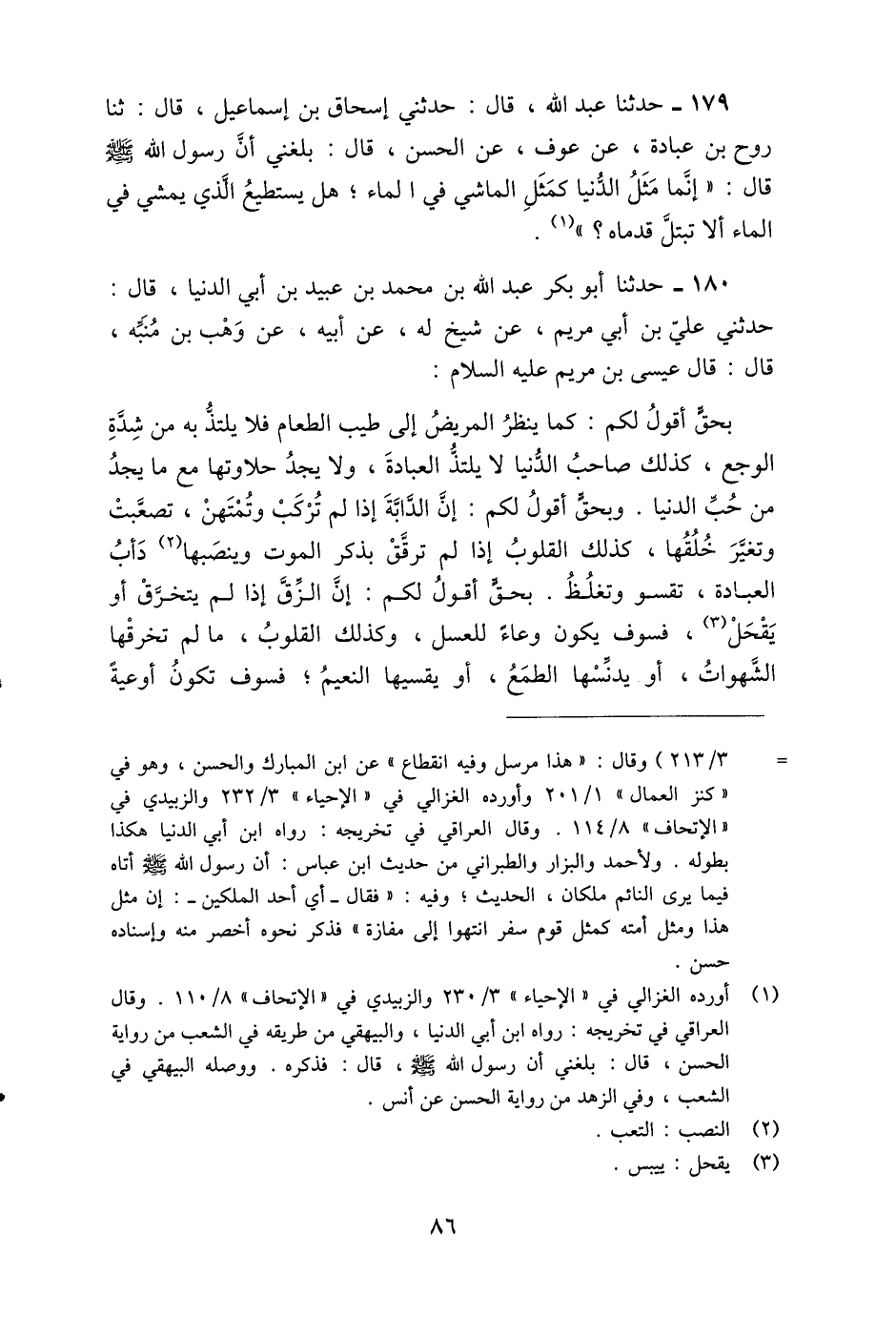 177 - حَدَّثَنِي إِسْحَاقُ بْنُ إِسْمَاعِيلَ، قَالَ: ثنا رَوْحُ بْنُ عُبَادَةَ، عَنْ عَوْفٍ، عَنِ الْحَسَنِ، قَالَ: بَلَغَنِي أَنَّ رَسُولَ اللَّهِ صَلَّى اللَّهُ عَلَيْهِ وَسَلَّمَ قَالَ: «إِنَّمَا §مَثَلُ الدُّنْيَا كَمَثَلِ الْمَاشِي فِي الْمَاءِ، هَلْ يَسْتَطِيعُ الَّذِي يَمْشِي فِي الْمَاءِ أَلَّا تَبْتَلَّ قَدَمَاهُ؟»