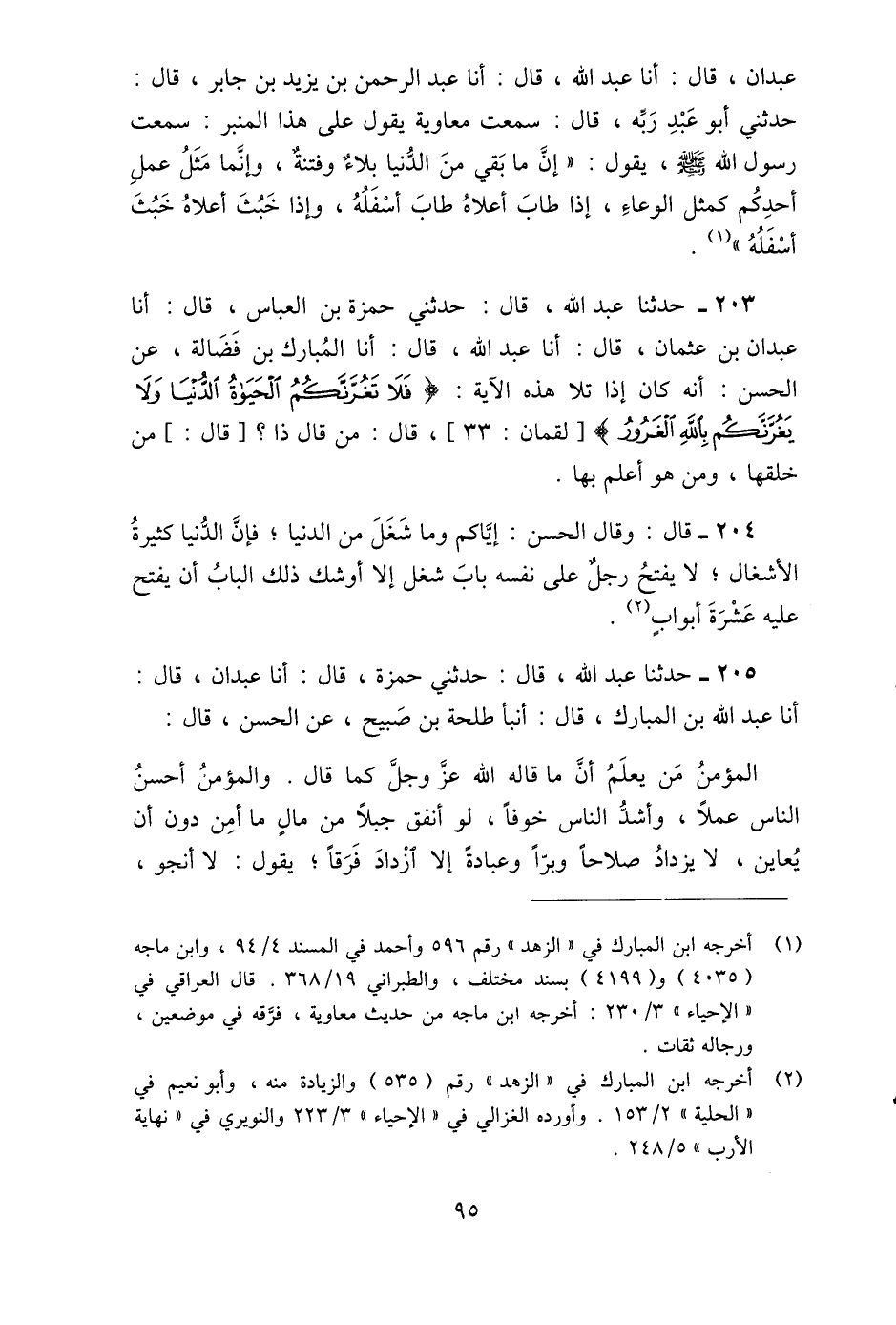 196 - حَدَّثَنِي حَمْزَةُ، قَالَ: أنا عَبْدَانُ، قَالَ: أنا عَبْدُ اللَّهِ بْنُ الْمُبَارَكِ، قَالَ: أنبا طَلْحَةُ بْنُ صُبَيْحٍ، عَنِ الْحَسَنِ، قَالَ: " §الْمُؤْمِنُ مَنْ يَعْلَمُ أَنَّ مَا قَالَهُ اللَّهُ عَزَّ وَجَلَّ كَمَا قَالَ، وَالْمُؤْمِنُ أَحْسَنُ النَّاسِ عَمَلًا، وَأَشَدُّ النَّاسِ خَوْفًا، لَوْ أَنْفَقَ جَبَلًا مِنْ مَالٍ مَا أَمِنَ دُونَ أَنْ يُعَايِنَ، وَلَا يَزْدَادُ صَلَاحًا وَبِرًّا وَعِبَادَةً إِلَّا ازْدَادَ فَرَقًا، يَقُولُ: وَلَا أَنْجُو، -[96]- وَالْمُنَافِقُ يَقُولُ: سَوَادُ النَّاسِ كَثِيرٌ وَسَيُغْفَرُ لِي، وَلَا بَأْسَ عَلَيَّ، يَسِيئُ فِي الْعَمَلِ وَيَتَمَنَّى عَلَى اللَّهِ عَزَّ وَجَلَّ