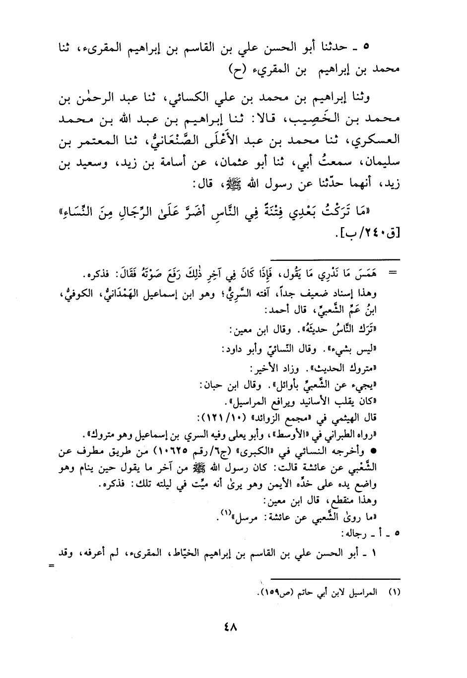 ح وَثنا إِبْرَاهِيمُ بْنُ مُحَمَّدِ بْنِ عَلِيٍّ الْكِسَائِيُّ، ثنا عَبْدُ الرَّحْمَنِ بْنُ مُحَمَّدِ بْنِ الْخَصِيبِ، قَالَا: ثنا إِبْرَاهِيمُ بْنُ عَبْدِ اللَّهِ بْنِ مُحَمَّدٍ الْعَسْكَرِيُّ، ثنا مُحَمَّدُ بْنُ عَبْدِ الْأَعْلَى الصَّنْعَانِيُّ، ثنا الْمُعْتَمِرُ بْنُ سُلَيْمَانَ، سَمِعْتُ أَبِي، ثنا أَبُو عُثْمَانَ، عَنْ أُسَامَةَ بْنِ زَيْدٍ، وَسَعِيدِ بْنِ زَيْدٍ، أنهما حدثانا، عن رَسُولِ اللَّهِ صَلَّى اللَّهُ عَلَيْهِ وَسَلَّمَ، قَالَ: «مَا تَرَكْتُ بَعْدِي فِتْنَةً فِي النَّاسِ أَضَرَّ عَلَى الرِّجَالِ مِنَ النِّسَاءِ»