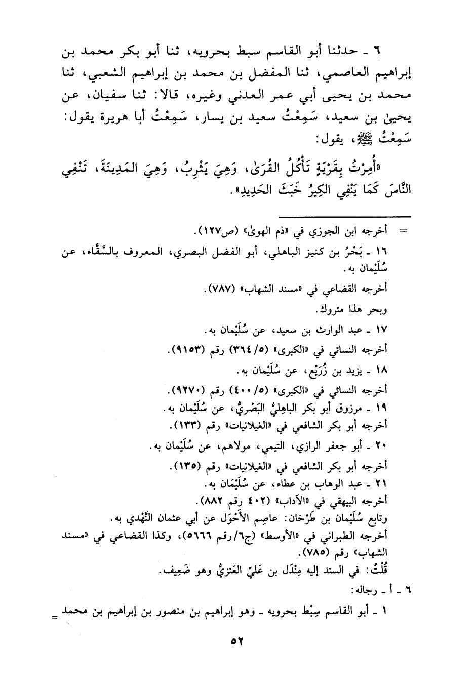 6 - حَدَّثَنَا أَبُو الْقَاسِمِ سَبْطُ بَحْرَوَيْهِ، ثنا أَبُو بَكْرِ بْنُ مُحَمَّدِ بْنِ إِبْرَاهِيمَ الْعَاصِمِيُّ، ثنا الْمُفَضَّلُ بْنُ مُحَمَّدِ بْنِ إِبْرَاهِيمَ الشَّعْبِيُّ، ثنا مُحَمَّدُ بْنُ يَحْيَى أَبِي عُمَرَ الْعَدْنِيُّ وَغَيْرُهُ، قَالَا: ثنا سُفْيَانُ، عَنْ يَحْيَى بْنِ سَعِيدٍ، سَمِعْتُ سَعِيدَ بْنَ يَسَارٍ، سَمِعْتُ أَبَا هُرَيْرَةَ، يَقُولُ: سَمِعْتُ رَسُولَ اللَّهِ صَلَّى اللَّهُ عَلَيْهِ وَسَلَّمَ، يَقُولُ: «أُمِرْتُ بِقَرْيَةٍ تَأْكُلُ الْقُرَى، وَهِيَ يَثْرِبُ، وَهِيَ الْمَدِينَةُ، تَنْفِي النَّاسَ كَمَا يَنْفِي الْكِيرُ خَبَثَ الْحَدِيدِ»