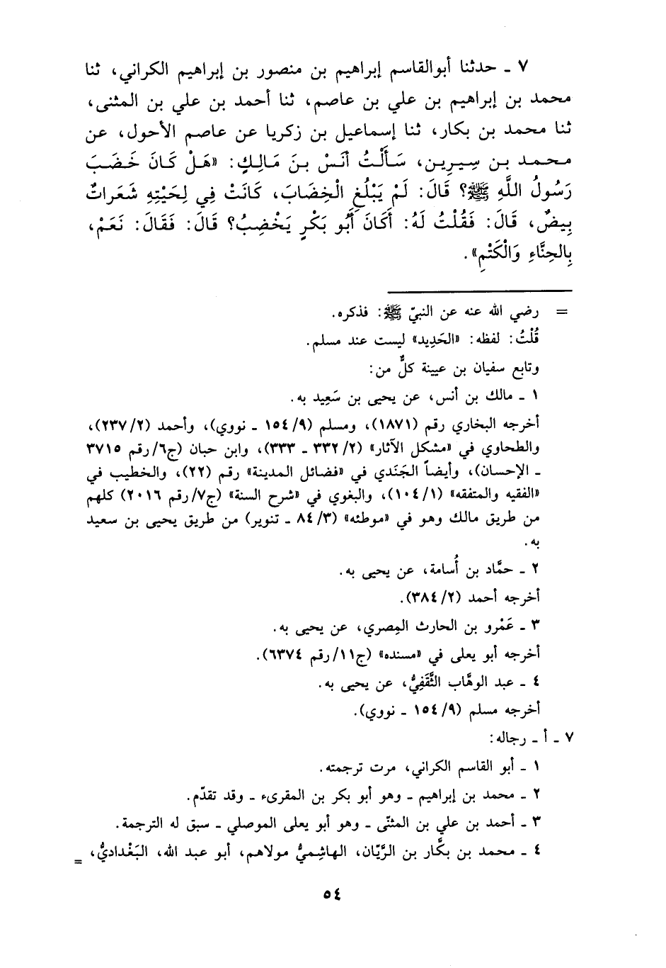7 - حَدَّثَنَا أَبُو الْقَاسِمِ إِبْرَاهِيمُ بْنُ مَنْصُورِ بْنِ إِبْرَاهِيمَ الْكَرَّانِيُّ، ثنا مُحَمَّدُ بْنُ إِبْرَاهِيمَ بْنِ عَلِيِّ بْنِ عَاصِمٍ، ثنا أَحْمَدُ بْنُ عَلِيِّ بْنِ الْمُثَنَّى، ثنا مُحَمَّدُ بْنُ بَكَّارٍ، ثنا إِسْمَاعِيلُ بْنُ زَكَرِيَّا، عَنْ عَاصِمٍ الْأَحْوَلِ، عَنْ مُحَمَّدِ بْنِ سِيرِينَ، سَأَلْتُ أَنَسَ بْنَ مَالِكٍ: " هَلْ كَانَ خَضَبَ رَسُولُ اللَّهِ صَلَّى اللَّهُ عَلَيْهِ وَسَلَّمَ؟ قَالَ: لَمْ يَبْلُغِ الْخِضَابَ، كَانَتْ فِي لِحْيَتِهِ شَعَراتٌ بِيضٌ، قَالَ: فَقُلْتُ لَهُ: أَكَانَ أَبُو بَكْرٍ يَخْضِبُ؟ قَالَ: فَقَالَ: نَعَمْ، بِالْحِنَّاءِ وَالْكَتْمِ "