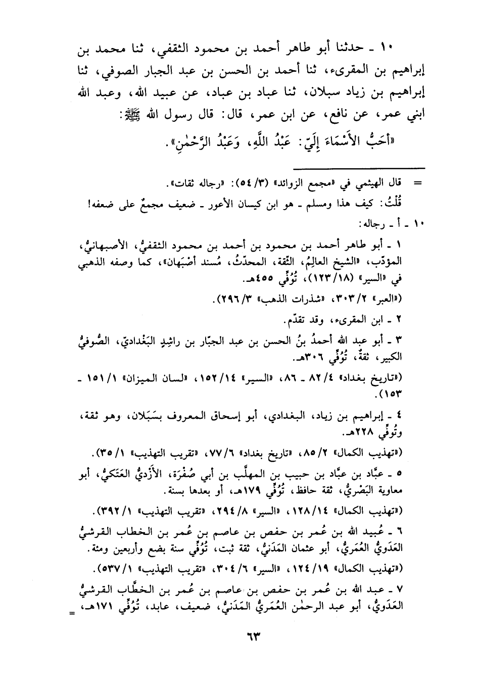 10 - حَدَّثَنَا أَبُو طَاهِرٍ أَحْمَدُ بْنُ مَحْمُودٍ الثَّقَفِيُّ، ثنا مُحَمَّدُ بْنُ إِبْرَاهِيمَ بْنِ الْمُقْرِئِ، ثنا أَحْمَدُ بْنُ الْحَسَنِ بْنِ عَبْدِ الْجَبَّارِ الصُّوفِيُّ، ثنا إِبْرَاهِيمُ بْنُ زِيَادٍ سَبْلَانُ، ثنا عَبَّادُ بْنُ عَبَّادٍ، عَنْ عُبَيْدَ اللَّهِ، وَعَبْدِ اللَّهِ ابني عمر، عَنْ نَافِعٍ، عَنِ ابْنِ عُمَرَ، قَالَ: قَالَ رَسُولُ اللَّهِ صَلَّى اللَّهُ عَلَيْهِ وَسَلَّمَ: " أَحَبُّ الْأَسْمَاءِ إِلَيَّ: عَبْدُ اللَّهِ، وَعَبْدُ الرَّحْمنِ "