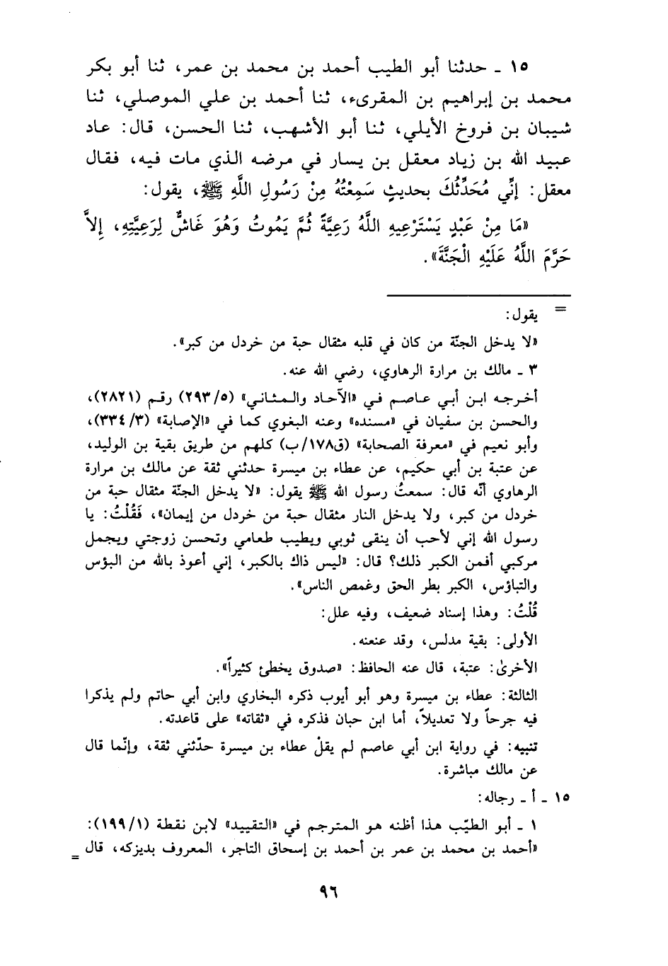 15 - حَدَّثَنَا أَبُو الطَّيِّبُ أَحْمَدُ بْنُ مُحَمَّدِ بْنِ عُمَرَ، ثنا أَبُو بَكْرٍ مُحَمَّدُ بْنُ إِبْرَاهِيمَ بْنِ الْمُقْرِئِ، ثنا أَحْمَدُ بْنُ عَلِيٍّ الْمَوْصِلِيُّ، ثنا شَيْبَانُ بْنُ فَرُّوخِ الْأَيْلِيُّ، ثنا أَبُو الْأَشْهَبِ، ثنا الْحَسَنُ، قَالَ: " عَادَ عُبَيْدُ اللَّهِ بْنُ زِيَادٍ مَعْقِلَ بْنَ يَسَارٍ فِي مَرَضِهِ الَّذِي مَاتَ فِيهِ، فَقَالَ مَعْقِلٌ: إِنِّي مُحَدِّثُكَ بِحَدِيثٍ سَمِعْتُهُ مِنْ رَسُولِ اللَّهِ صَلَّى اللَّهُ عَلَيْهِ وَسَلَّمَ، يَقُولُ: «مَا مِنْ عَبْدٍ يَسْتَرْعِيهِ اللَّهُ رَعِيَّةً ثُمَّ يَمُوتُ وَهُوَ غَاشٌّ لِرَعِيَّتِهِ، إِلَّا حَرَّمَ اللَّهُ عَلَيْهِ الْجَنَّةَ»