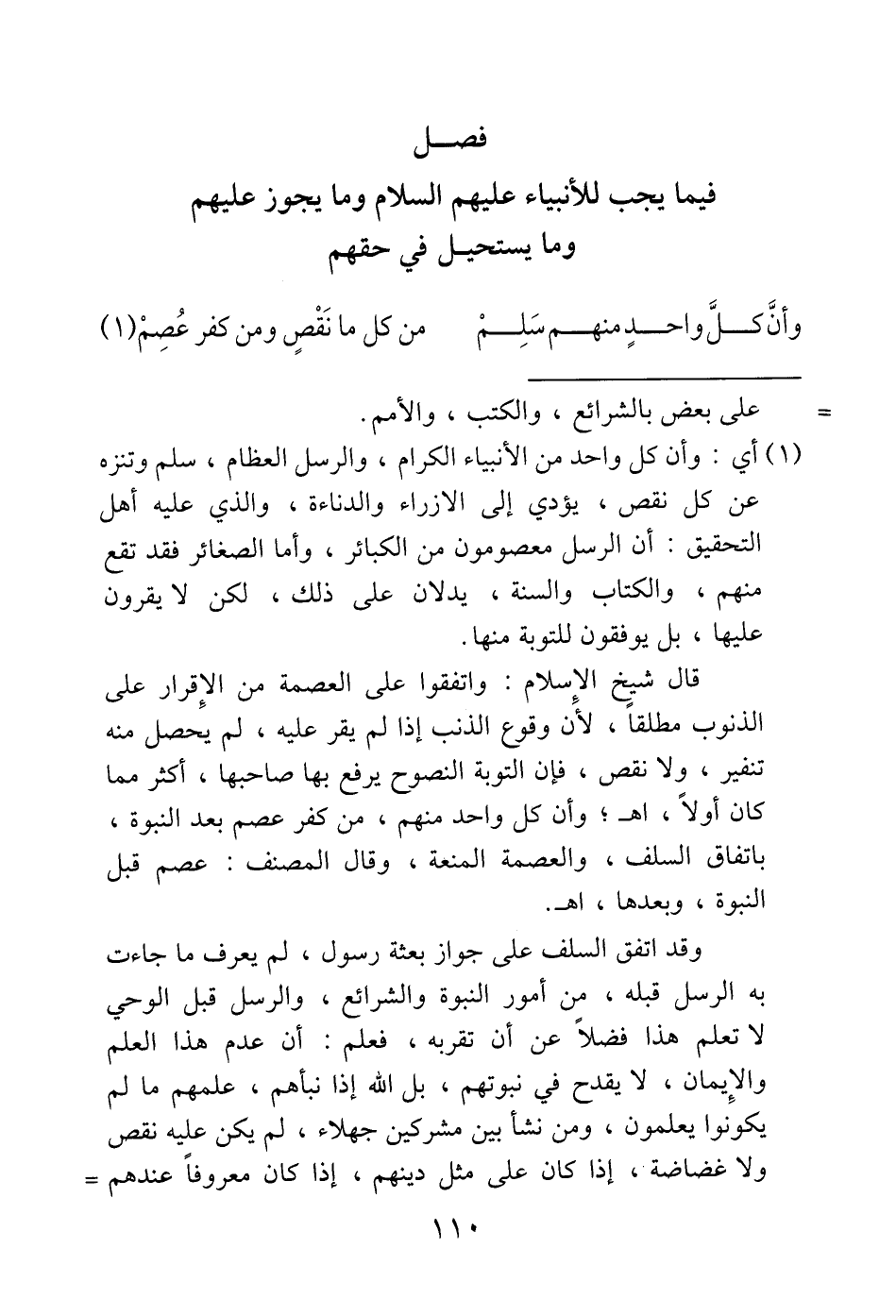 (¬1) أي: وأن كل واحد من الأنبياء الكرام، والرسل العظام، سلم وتنزه عن كل نقص، يؤدي إلى الإزراء والدناءة، والذي عليه أهل التحقيق: أن الرسل معصومون من الكبائر، وأما الصغائر فقد تقع منهم، والكتاب والسنة يدلان على ذلك، لكن لا يقرون عليها، بل يوفقون للتوبة منها.