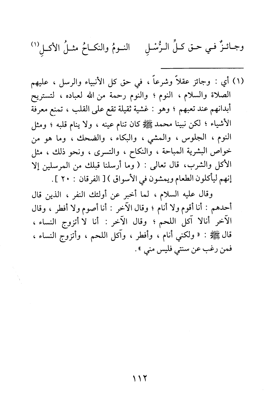 (¬1) أي: وجائز عقلًا وشرعًا، في حق كل الأنبياء والرسل، - عليهم الصلاة والسلام - النوم؛ والنوم رحمة من الله لعباده، لتستريح أبدانهم عن تعبهم، وهو: غشية ثقيلة تقع على القلب، تمنع معرفة الأشياء، لكن نبينا محمد - صلى الله عليه وسلم - كان تنام عينه، ولا ينام قلبه؛ ومثل النوم: الجلوس، والمشي والبكاء، والضحك، وما هو من خواص البشرية المباحة، والنكاح، والتسري، ونحو ذلك، مثل الأكل والشرب قال تعالى: {وَمَا أَرْسَلْنَا قَبْلَكَ مِنَ الْمُرْسَلِينَ إِلَّا إِنَّهُمْ لَيَأْكُلُونَ الطَّعَامَ وَيَمْشُونَ فِي الْأَسْوَاقِ} [الفرقان: 20] .