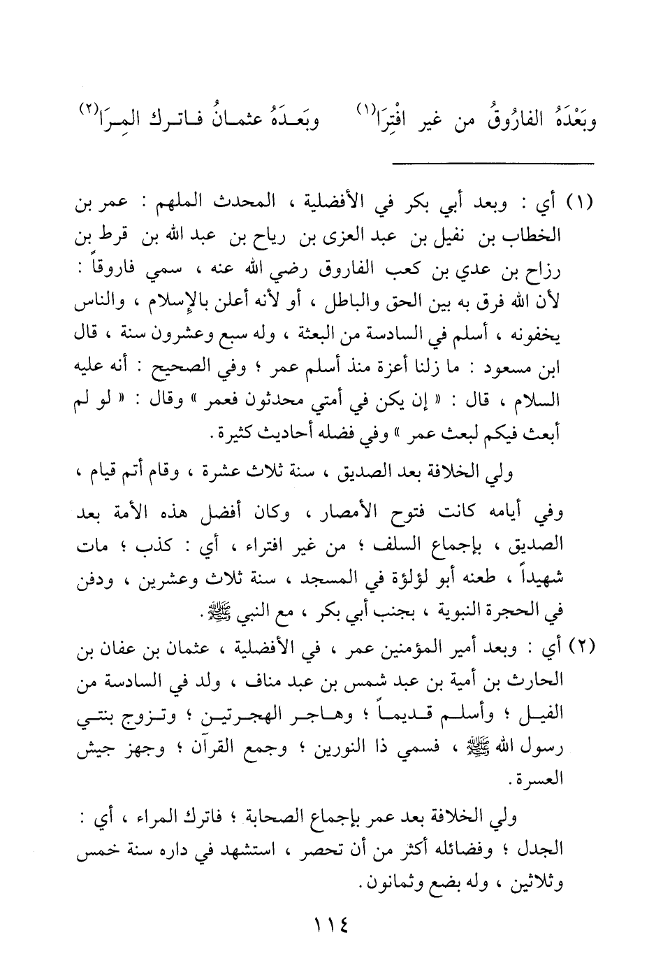 ولي الخلافة بعد الصديق، سنة ثلاث عشرة، وقام أتم قيام، وفي أيامه كانت فتوح الأمصار، وكان أفضل هذه الأمة بعد الصديق، بإجماع السلف من غير افتراء، أي: كذب؛ مات شهيدًا، طعنه أبو لؤلؤة في المسجد، سنة ثلاث وعشرين، ودفن في الحجة النبوية، بجنب أبى بكر، مع النبي - صلى الله عليه وسلم -.