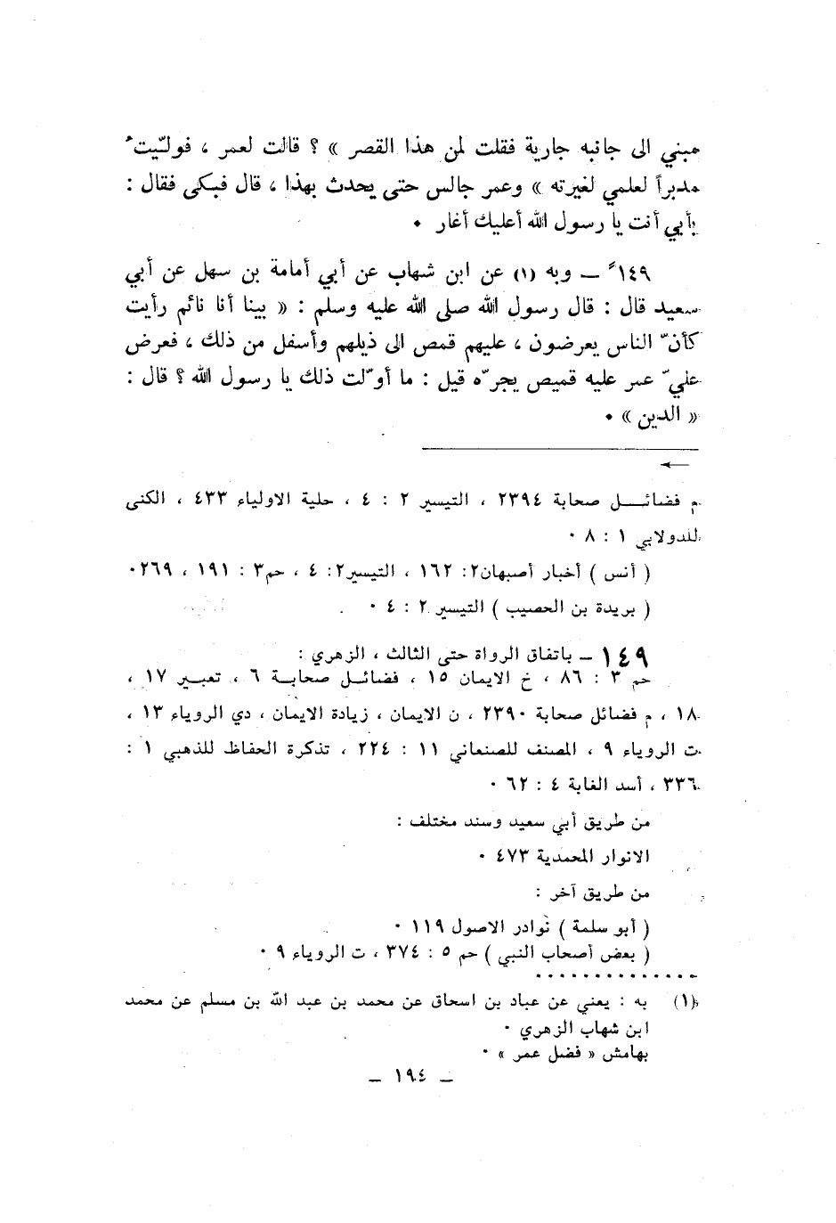 ١٤٩ - وَبِهِ عَنِ ابْنِ شِهَابٍ، عَنْ أَبِي أُمَامَةَ بْنِ سَهْلٍ، عَنْ أَبِي سَعِيدٍ، قَالَ: قَالَ رَسُولُ اللَّهِ صَلَّى اللهُ عَلَيْهِ وَسَلَّمَ: «بَيْنَا أَنَا نَائِمٌ رَأَيْتُ كَأَنَّ النَّاسَ يُعْرَضُونَ، عَلَيْهِمْ قُمُصٌ إِلَى ذَيْلِهِمْ وَأَسْفَلَ مِنْ ذَلِكَ، فَعُرِضَ عَلَيَّ عُمَرُ، عَلَيْهِ قَمِيصٌ يَجُرُّهُ» . قِيلَ: مَا أَوَّلْتَ ذَلِكَ يَا رَسُولَ اللَّهِ؟ قَالَ: «الدِّينُ»