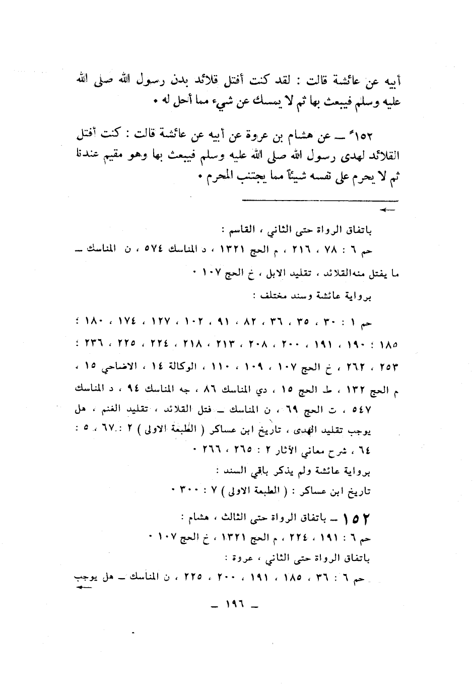 ١٥٢ - عَنْ هِشَامِ بْنِ عُرْوَةَ، عَنْ أَبِيهِ، عَنْ عَائِشَةَ، قَالَتْ: «كُنْتُ أَفْتِلُ الْقَلَائِدَ لِهَدْيِ رَسُولِ اللَّهِ صَلَّى اللهُ عَلَيْهِ وَسَلَّمَ، فَيَبْعَثُ بِهَا وَهُوَ مُقِيمٌ عِنْدَنَا، ثُمَّ لَا يُحَرِّمُ عَلَى نَفْسِهِ شَيْئًا مِمَّا يَجْتَنِبُ الْمُحْرِمُ»